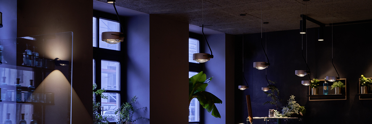 Betont sachlich präsentieren sich die Strahler der Designlinie Occhio Più. Sie schmiegen sich eng unter die Decke oder an die Wand. Die Occhio Sento Sospeso eignet sich zum Beispiel dafür, die Zurückhaltung über dem Esstisch zu durchbrechen. Die Pendelleuchte erschließt eine weitere Ebene, weil sie in den Raum hineinreicht. Dem Minimalismus der Più Spots bleibt sie aber treu. Die Lichtgestaltung wirkt deshalb rundum stimmig.