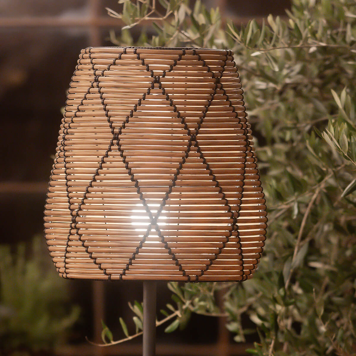 Die Lollo-Lampenschirme bestehen aus hochwertigem Kunst-Rattan, einem wetterbeständigen Material, das speziell für den Einsatz im Freien entwickelt wurde. Polyrattan ist nicht nur langlebig und beständig gegen Wettereinflüsse, sondern auch ästhetisch ansprechend. Die geflochtene Struktur des Schirms, akzentuiert durch die eingewobenen schwarzen Fäden, fängt das Licht auf einzigartige Weise ein und schafft abends wie auch tagsüber eine warme, einladende Atmosphäre.
