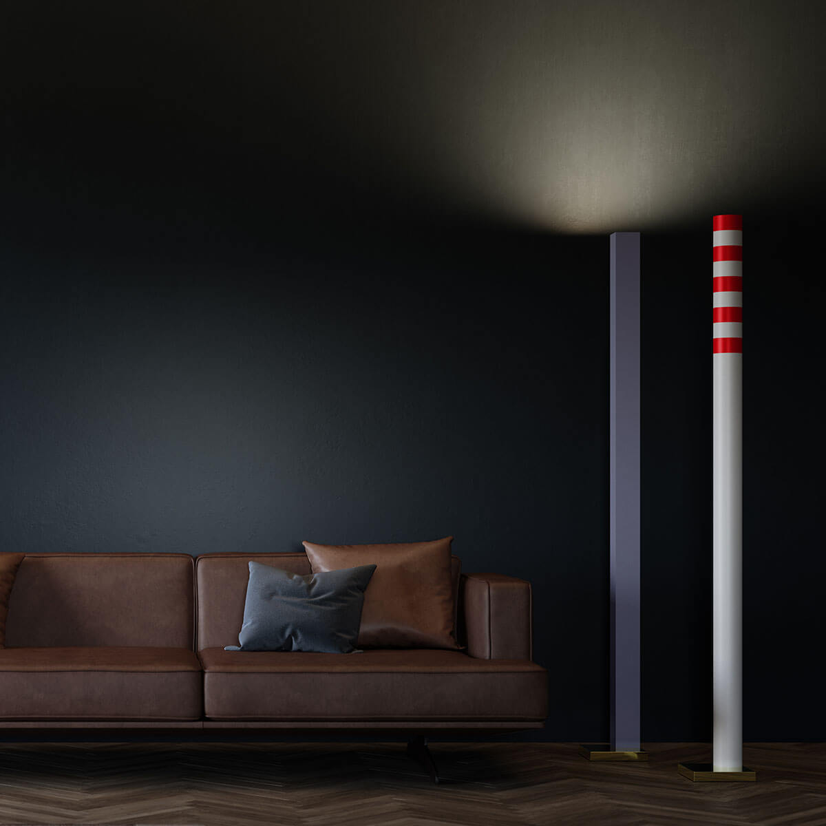 Gestalterisch überzeugt die Leuchte durch ihre klaren Linien und ausdrucksstarken Oberflächen. Erhältlich ist sie in klassischem Mattweiß oder in einer markanten Variante mit rot-weißem Schachbrettmuster und Sockel mit Messingfinish – eine direkte Referenz an traditionelle Industrieschornsteine. Für individuelle Projekte stehen Sonderfarben aus der Rotaliana Satin und Ethic Collection wie Graphit, Luxus-Gold, Mattbronze, Schwarz matt oder Champagne gegen Aufpreis zur Verfügung.