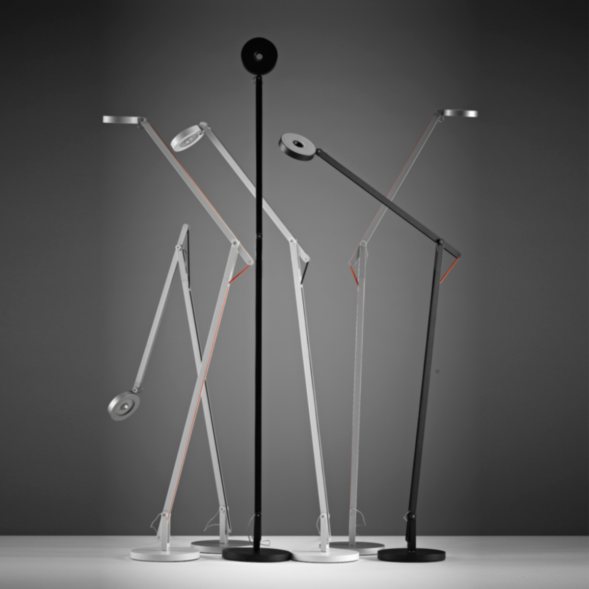 Rotaliana String F1 LED Stehleuchte mit orangefarbenem Verstellband, verstellbares Gelenk (nicht inkl. auf Anfrage erhältlich, die Leuchte wird mit einem silberfarbenem Verstellband geliefert)