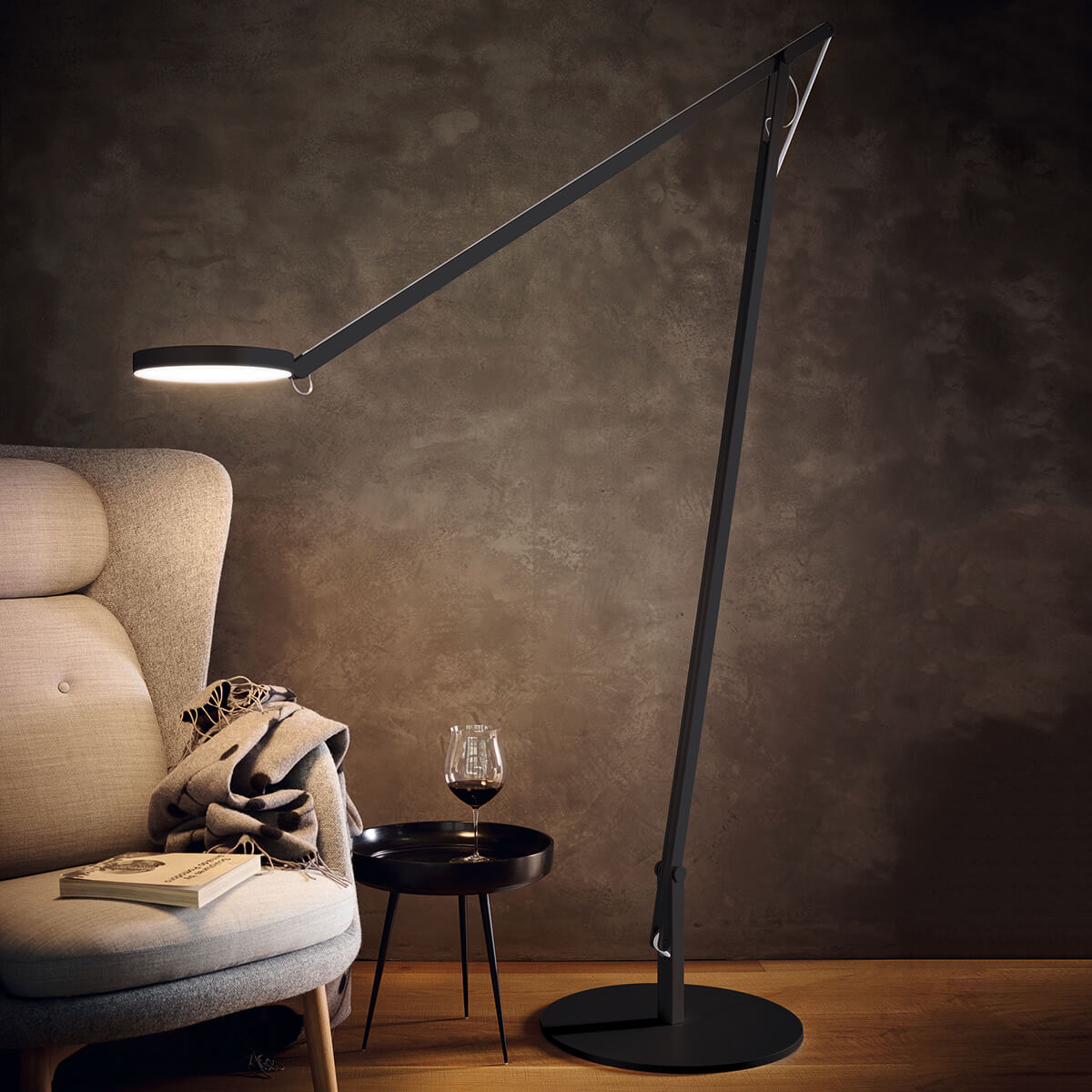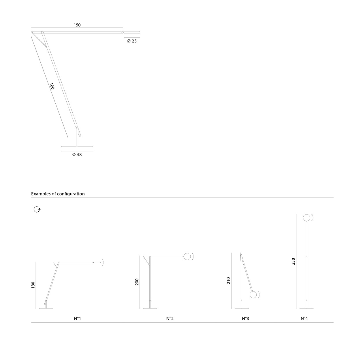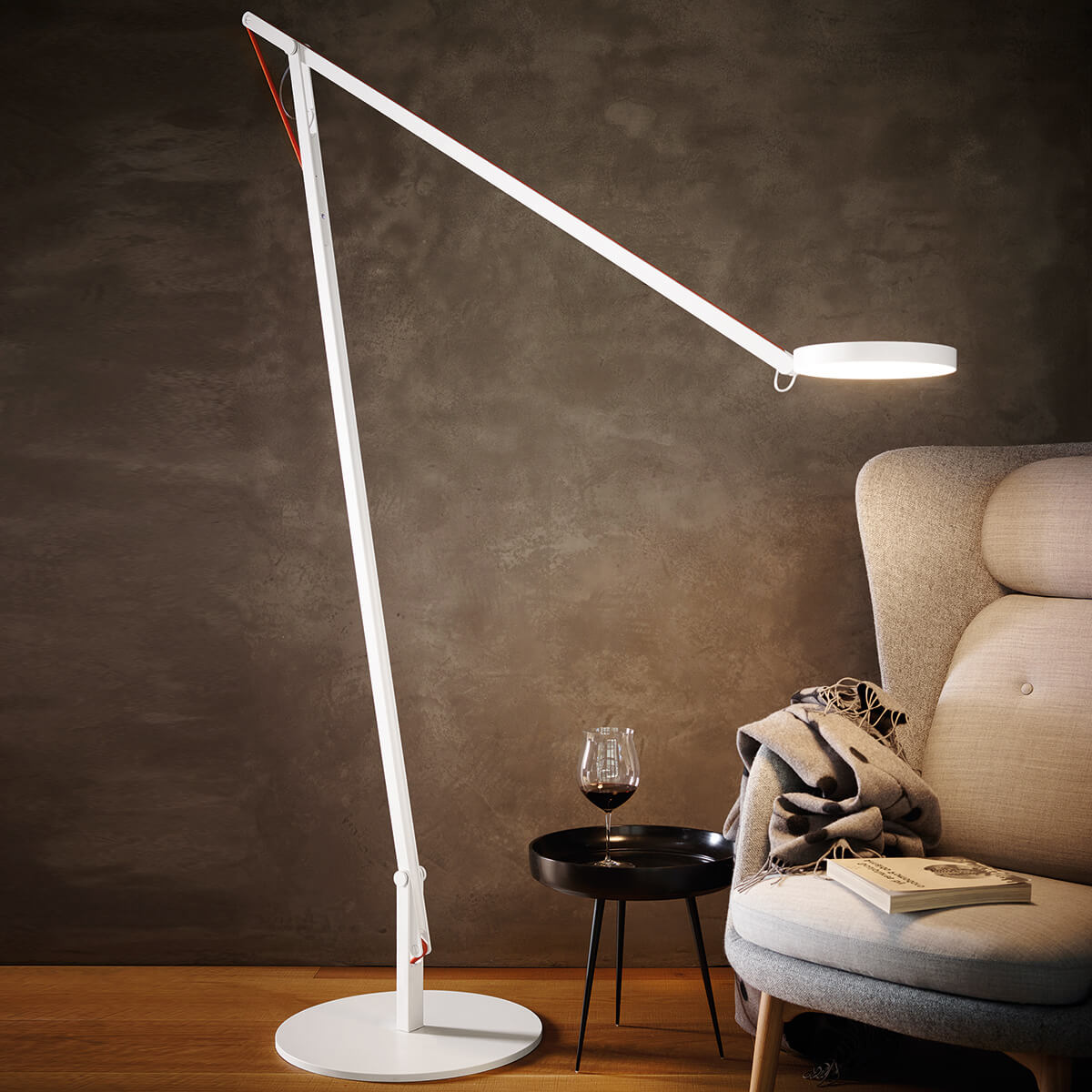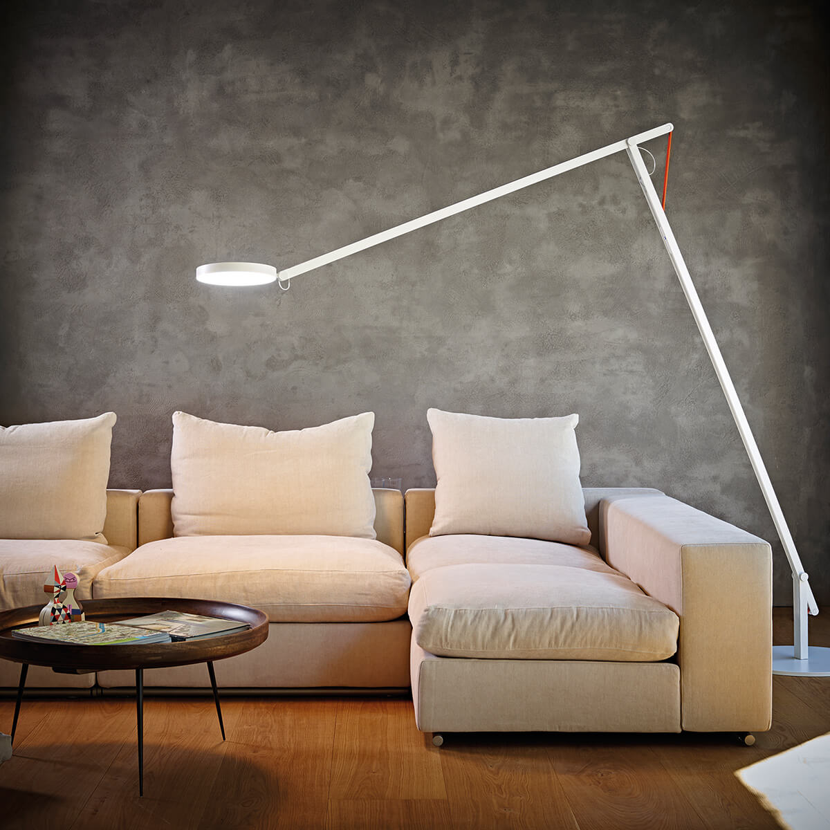 Die String XL von Rotaliana ist die große Version der String Tischleuchte. Es ist eine regulierbare Stehlampe, entworfen um ein Gebiet des Hauses von oben zu beleuchten: eine Ecke der Couch, des Esstischs, des Bürobereiches. Der Drehzapfenkopf ist aus gespritztem Aluminium und Polykarbonat, wohingegen der Leuchtenfuß aus Stahl ist. Die Bewegung der Lampe wird durch die elastische Schnur ersetzt, die aus synthetischem Stoff ist.