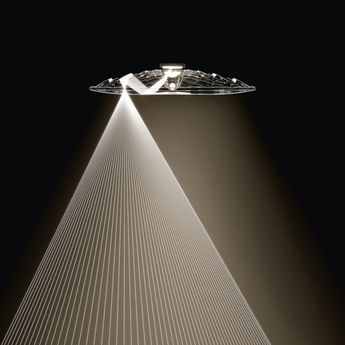 Das innovative Design der Nivo zeichnet sich durch eine High-Tech-Hybrid-Linse mit Aluminium-Coating aus, die aus optischem Polycarbonat mit hoher Transmission besteht. Einzeln berechnete Mikrofacetten im inneren der Linse, deren Anordnung an die florale Struktur einer Margerite erinnert, erzeugen eine homogene, blendfreie Lichtverteilung und vermeiden unerwünschte Effekte wie Stufungen oder Schlieren.