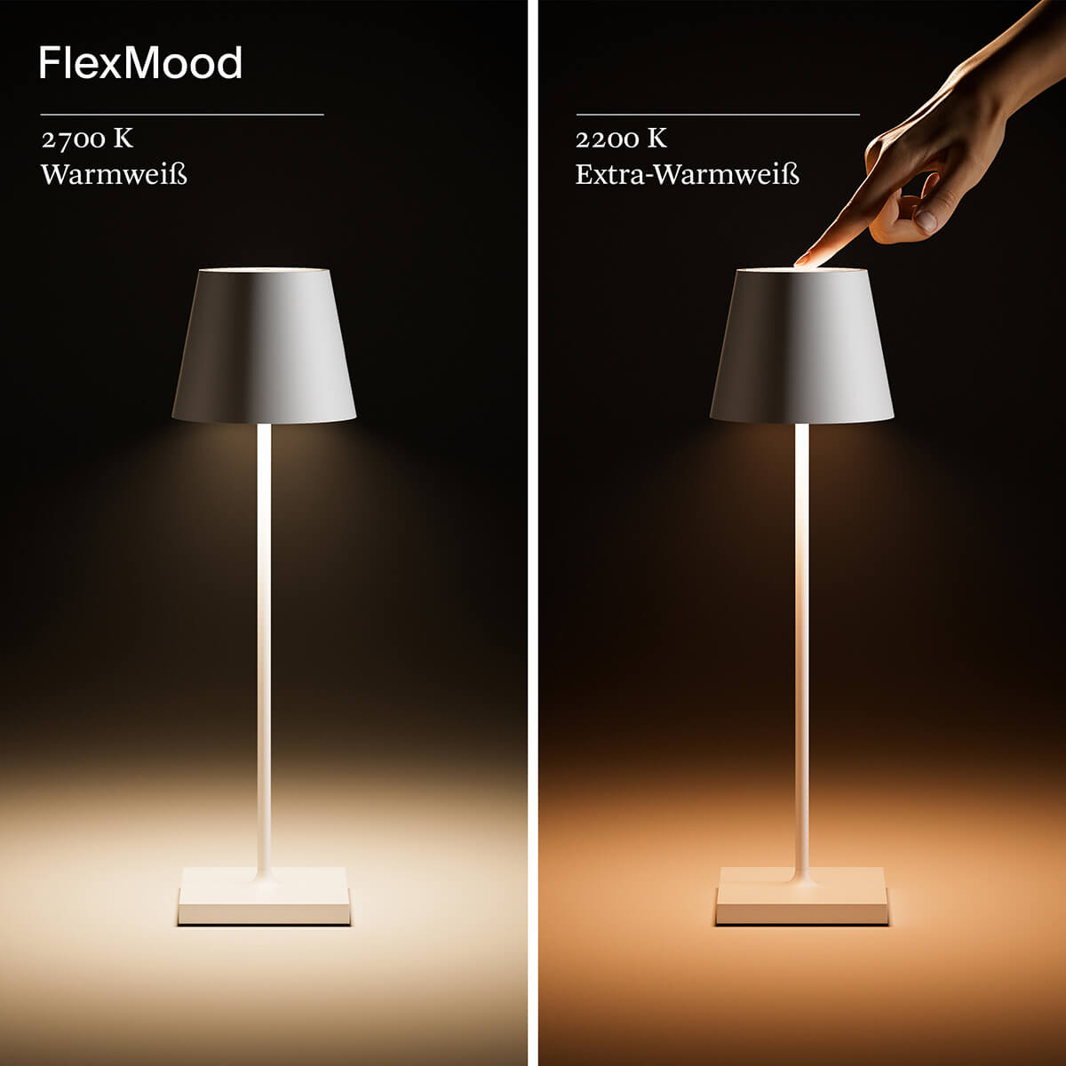 Dank Flex-Mood-Technik können Sie die Lichtfarbe der Lampe einfach per Touch an die gewünschte Raumstimmung anpassen: Wählen Sie zwischen warmweißen 2.700 Kelvin für ein wohnliches Licht und extrawarmen, kerzenscheinähnlichen 2.200 Kelvin für Momente voller Behaglichkeit. Wohlfühlstimmung garantiert!