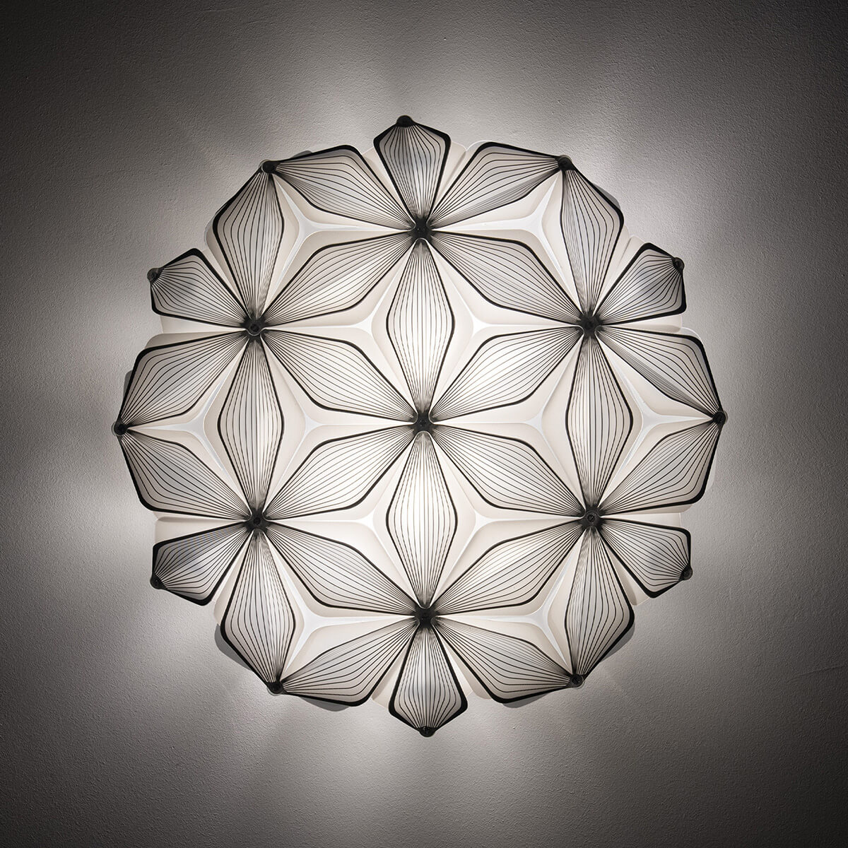 Inspiriert von floralen Formen, entfaltet die Lampe eine starke visuelle Präsenz, ohne den Raum zu dominieren. Die gebogenen "Blütenblätter" schaffen ein lebendiges Spiel aus Licht und Schatten und sorgen für eine diffus gestreute, weiche Lichtwirkung, die Räume einladend und harmonisch gestaltet. Ob an der Wand oder an der Decke montiert – die C’est La Vie definiert Räume durch Licht und Design gleichermaßen und fügt sich mühelos in zeitgenössische, minimalistische Architekturen ein.