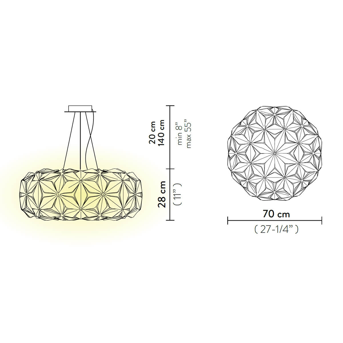 Die C’est La Vie Suspension Large von Slamp ist die eindrucksvollste Variante der gleichnamigen Leuchtenkollektion. Mit einem Durchmesser von 70 cm entfaltet sie eine starke skulpturale Präsenz und sorgt zugleich für eine besonders intensive, stimmungsvolle Beleuchtung. Die Design-Pendelleuchte eignet sich deshalb vor allem für großzügige Wohnzimmer, große Esstische, Sofalandschaften sowie für den professionellen Einsatz in Hotellerie, Lounge und Gastronomie.