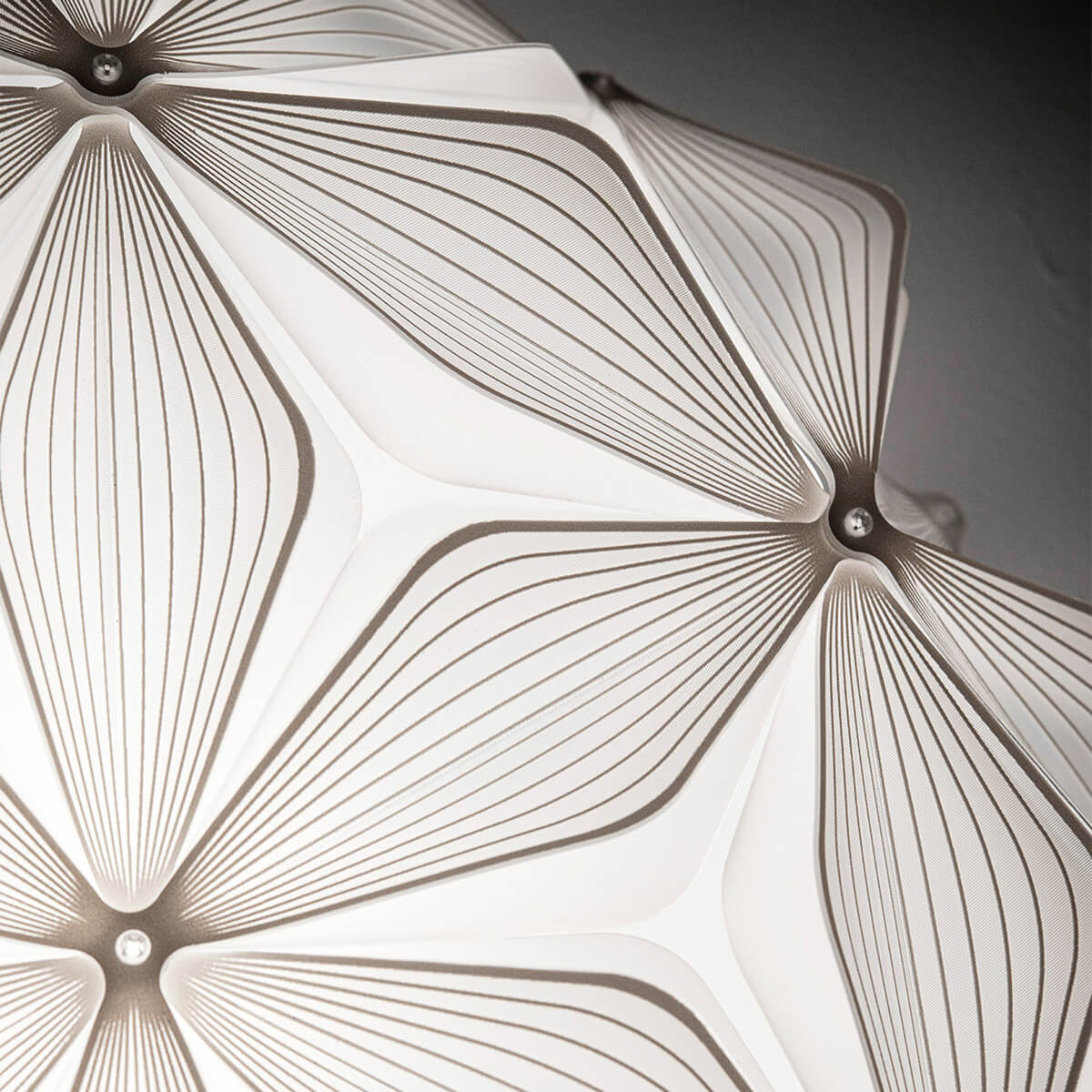 Der Leuchtenschirm besteht aus den exklusiven Slamp-Technopolymeren Lentiflex® und Opalflex®. Lentiflex® lenkt das Licht durch seine prismatische Struktur gezielt, während Opalflex® für eine gleichmäßige, blendfreie Lichtverteilung sorgt. Beide Materialien sind langlebig, unzerbrechlich, UV- und hitzebeständig sowie vollständig recycelbar.
