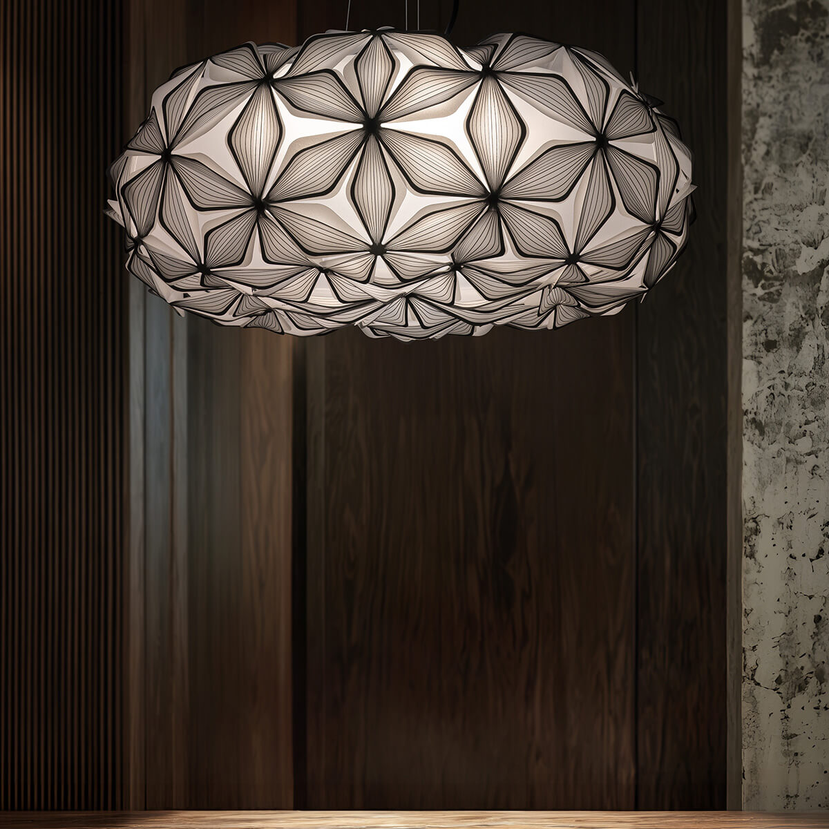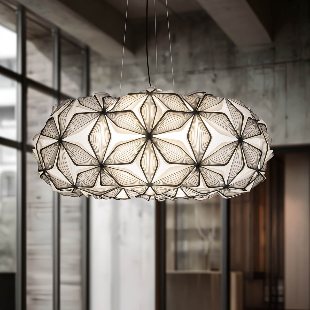 Der von floralen Formen inspirierte Schirm wirkt wie eine schwebende Lichtskulptur. Die fein geschwungenen „Blüten“ umhüllen die Lichtquelle und erzeugen ein rundum gestreutes, weiches Licht, das sowohl den Raum als auch die darunterliegenden Flächen gleichmäßig erhellt. Über großen Tischen oder Sitzbereichen entsteht so ein ausgewogenes Lichtbild mit wohnlicher Tiefe. Besonders eindrucksvoll wirkt die Leuchte auch als zentrales Statement-Piece in offenen Wohnkonzepten oder repräsentativen Objektbereichen.