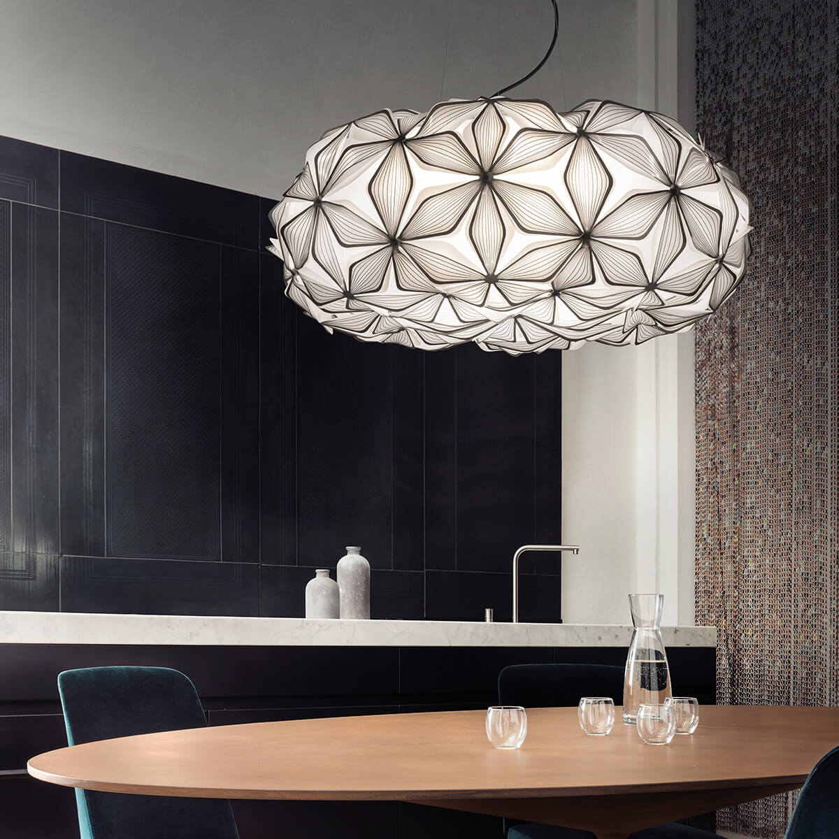 Ein besonderes Qualitätsmerkmal ist das magnetische Befestigungssystem von Slamp. Die dekorativen Schirmelemente lassen sich mit einem einfachen Klick von der Aufhängung lösen, was Montage, Reinigung und Wartung deutlich vereinfacht. Gerade in stark frequentierten Bereichen wie Restaurants, Hotels oder Lobbys ist dieses System ein großer Vorteil und sorgt für dauerhaft gepflegte Lichtobjekte.