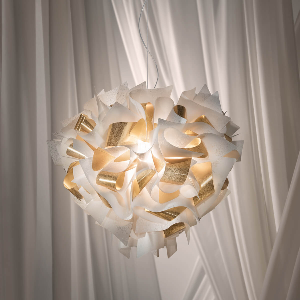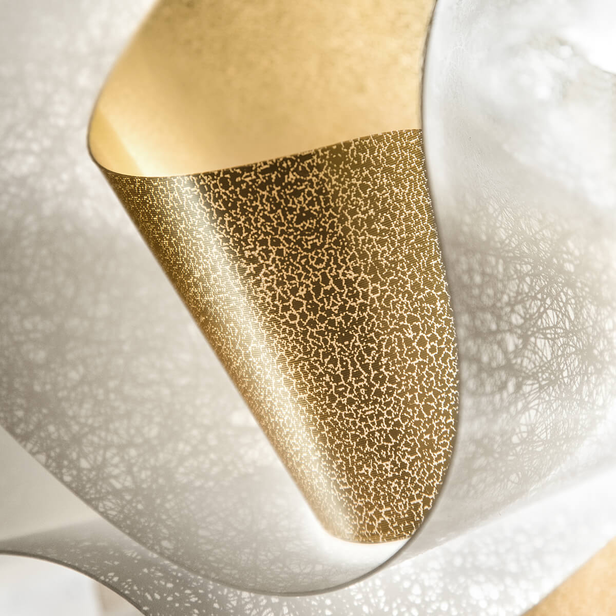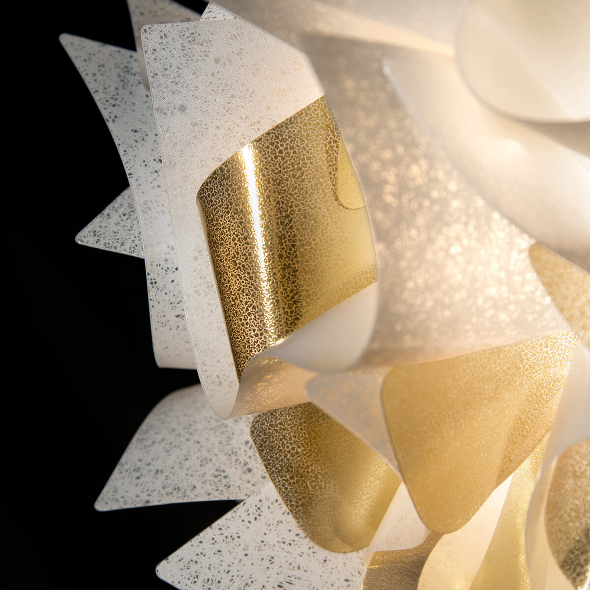 Wie alle Slamp Veli Leuchten zeichnet sich die Veli Aurea durch dynamische Linien und fließende Formen aus. Eine besondere Art der Veredelung erfährt sie durch die mit Goldfolie überzogenen Bänder aus Lentiflex®, die dem Leuchtenschirm eingeflochten sind und mit ihrem Craquelee-Effekt faszinieren. In Kombination mit den weißen Elementen aus seidig schimmerndem Opalflex® ergibt sich eine prachtvolle Ästhetik, die jeden Raum erhellt.
