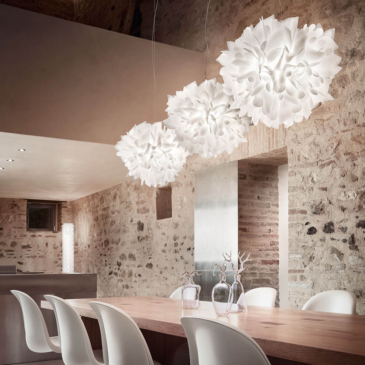 Eine Hymne an die Natur! Kunststoffteile, die bei der Herstellung der Veli Foliage Suspension Large übrig bleiben, werden von Slamp für den Bau von Nistkästen für Hummeln weiterverwendet.