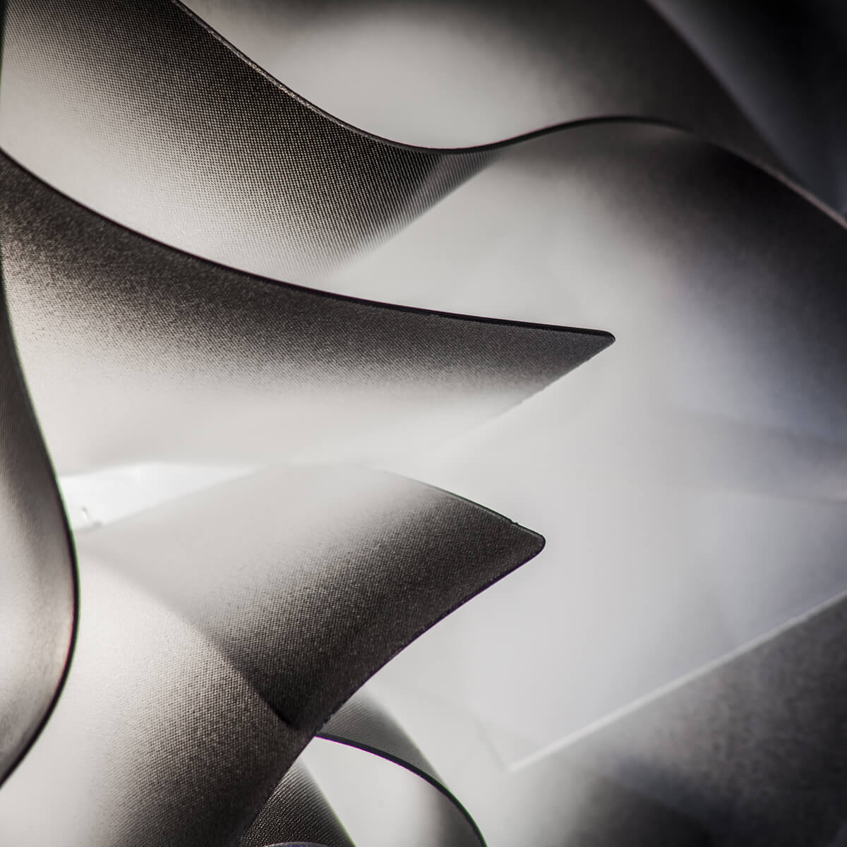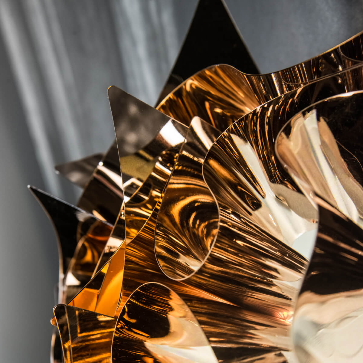 Gefertigt aus den patentierten Technopolymeren von Slamp, überzeugt die Leuchte durch Widerstandsfähigkeit, UV- und Hitzebeständigkeit sowie eine umweltfreundliche und recycelbare Materialzusammensetzung. Während weißes Opalflex® für ein weiches, opalisierendes Licht sorgt, verleiht Lentiflex® dem Modell faszinierende, schillernde Lichtreflexe. In den edlen Ausführungen aus Goldflex® oder Copperflex® entfaltet die Veli Suspension Large eine besonders luxuriöse Wirkung.