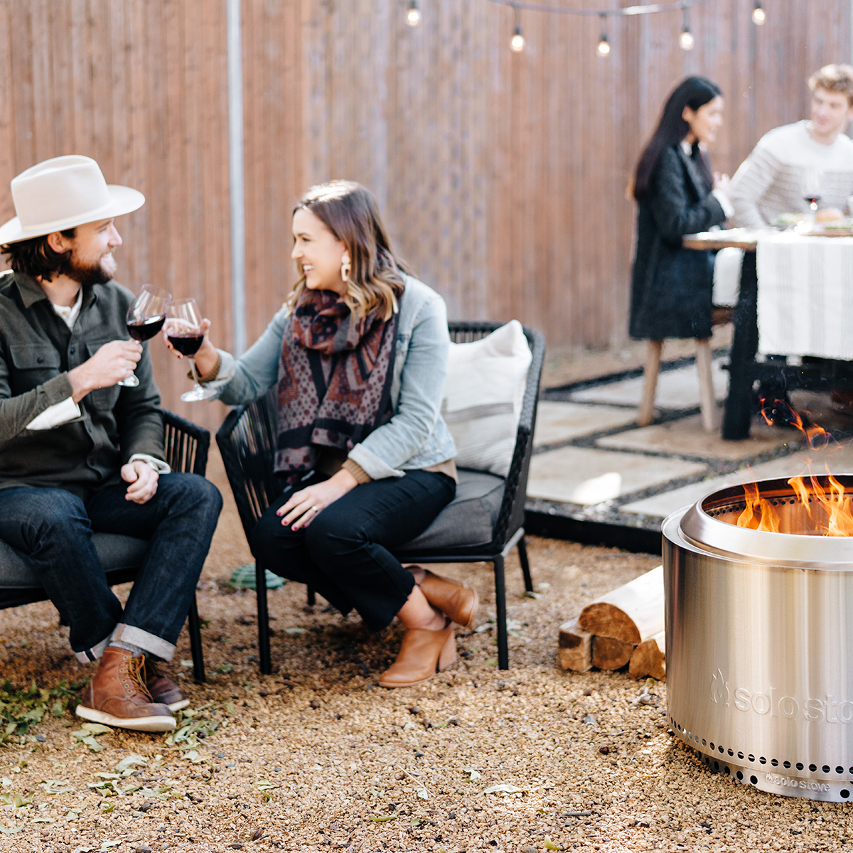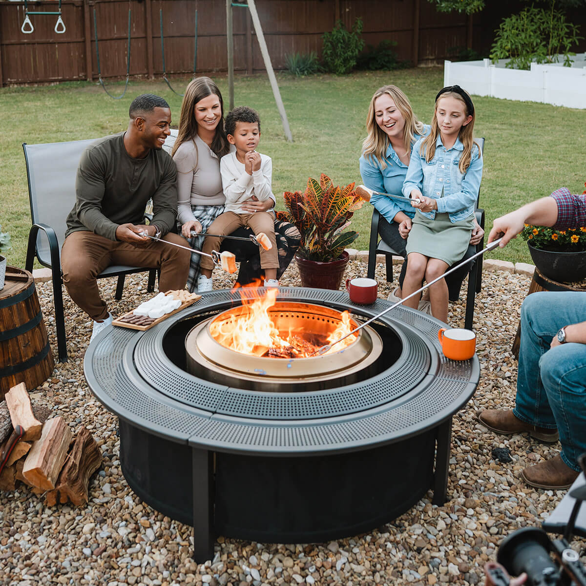 Im Mittelpunkt steht die Yukon 2.0 Feuerschale, die mit ihrer beeindruckenden Flammenhöhe von bis zu 1,5 Metern ideal für größere Gruppen und Outdoor-Events ist. Dank der innovativen 360°-Luftzirkulationstechnologie von Solo Stove verbrennt das Holz fast rauchfrei, sodass Sie die Wärme des Feuers ohne die Belästigung durch Qualm genießen können. Die entnehmbare Auffangschale erleichtert das Reinigen nach dem Gebrauch.