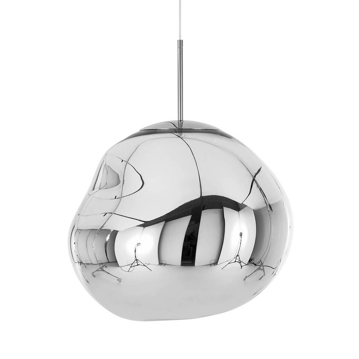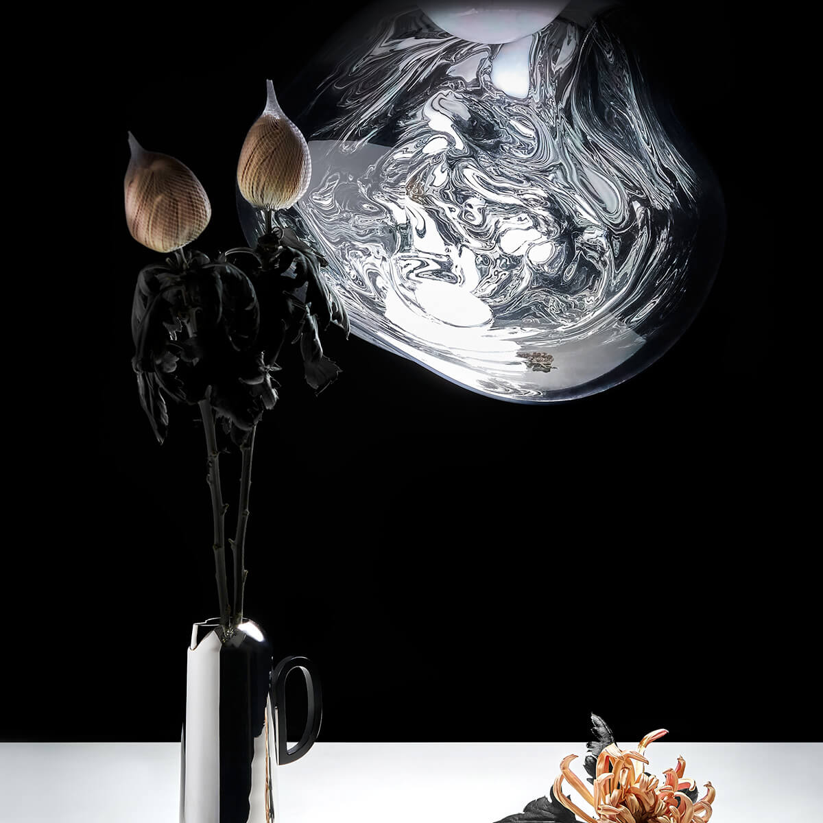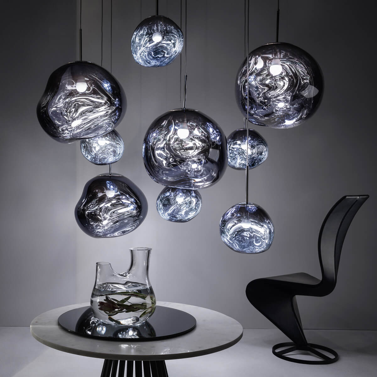 Die Melt Pendelleuchte von Tom Dixon ist ein außergewöhnliches Designobjekt, das Räume in ein faszinierendes Licht taucht und wie eine schwebende Skulptur wirkt. Ihre verzerrte, organische Form erinnert an geschmolzenes Glas oder fließende Gletscher und sorgt für ein atemberaubendes Spiel aus Licht und Reflexion. Im eingeschalteten Zustand leuchtet die Melt von innen heraus, während sie ausgeschaltet mit ihrer spiegelartigen Oberfläche beeindruckt.