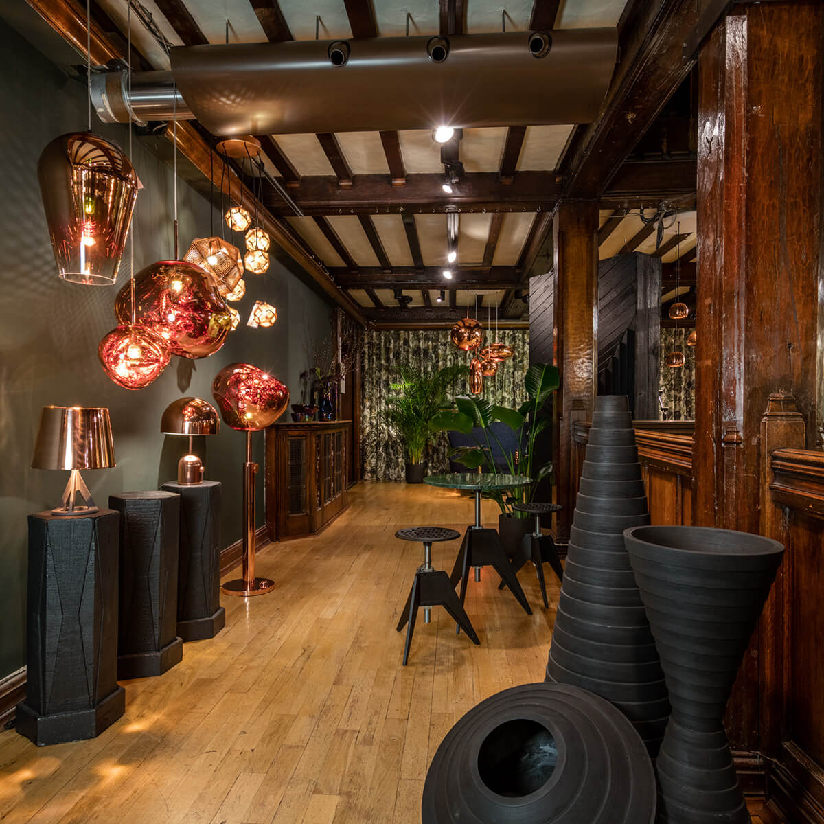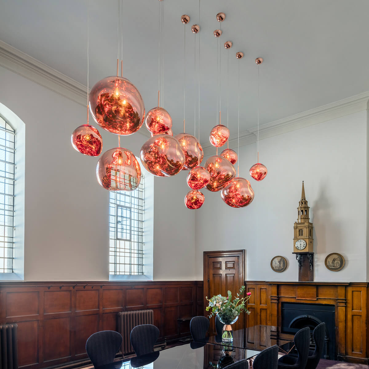 Erhältlich in den edlen Finishes Kupfer, Silber, Gold, Bronze und Smoke sowie in einer opaleszenten Variante mit silberner oder goldener Aufhängung, passt sich die Tom Dixon Melt Lampe mühelos an verschiedene Raumkonzepte an. Ob als einzelner Blickfang über einem Esstisch oder als Teil einer größeren Installation in Lobbys und Foyers – die Melt setzt überall stilvolle Akzente.