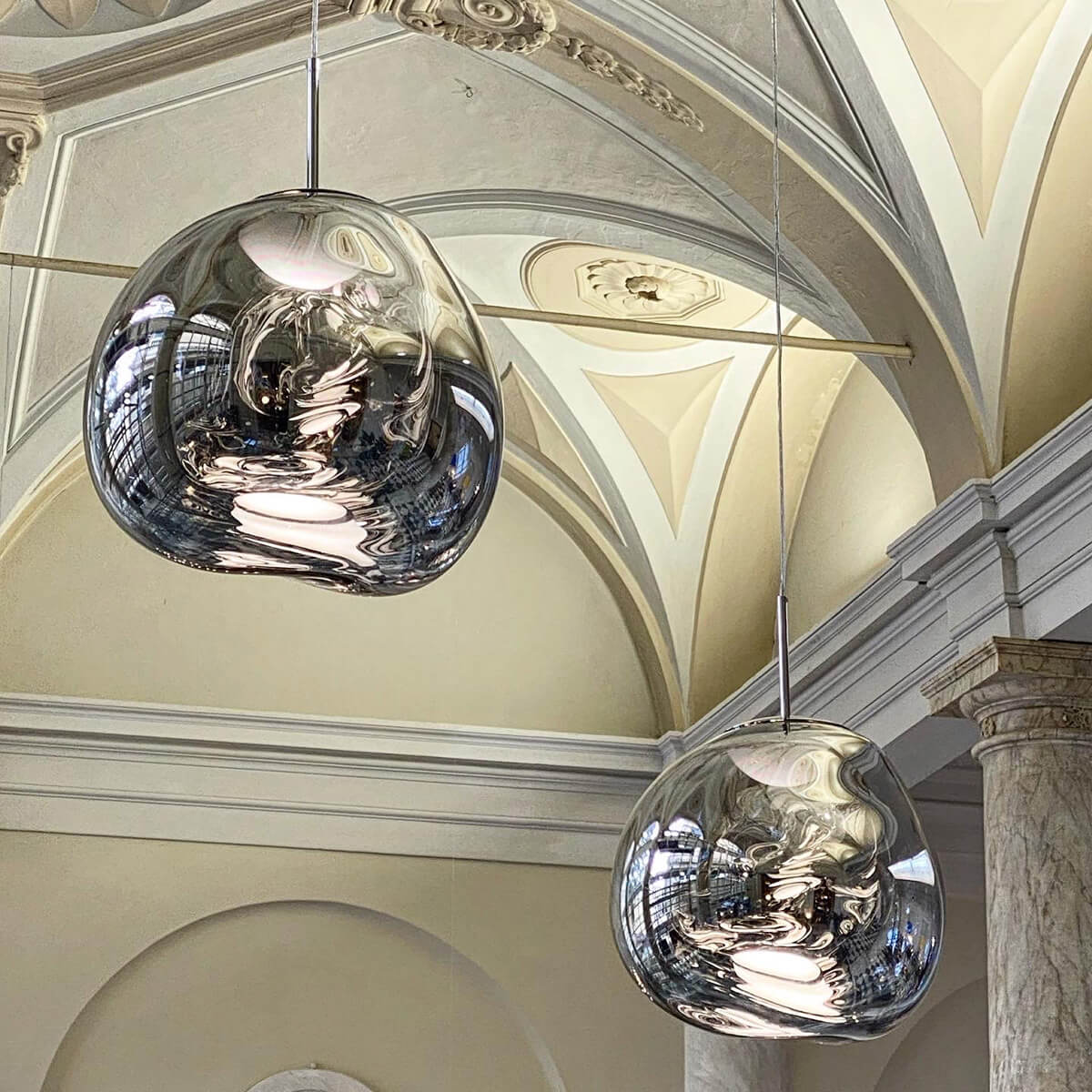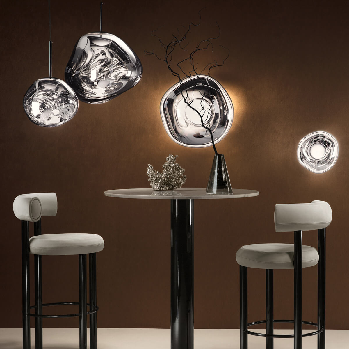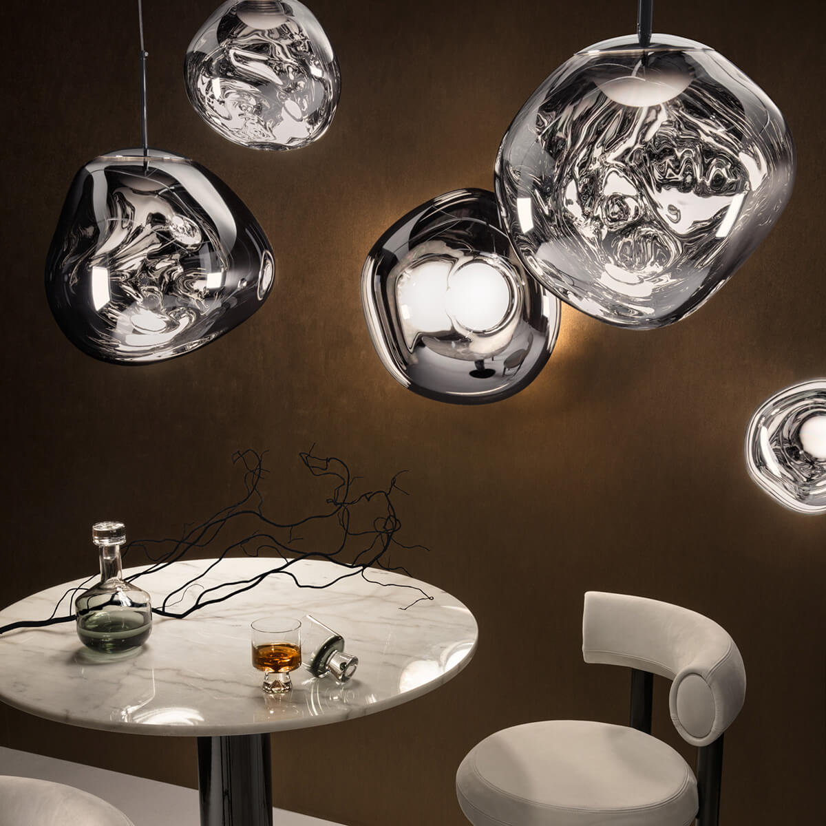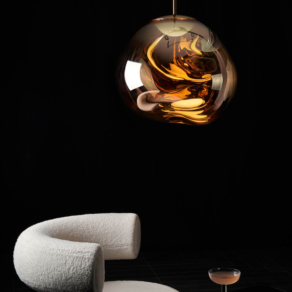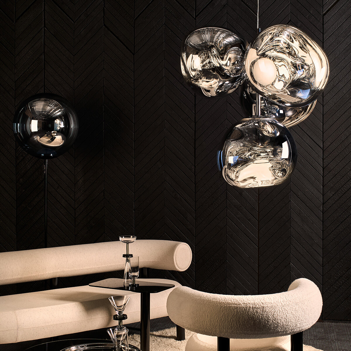 Erhältlich in den edlen Finishes Kupfer, Silber, Gold, Bronze und Smoke sowie in einer opaleszenten Variante mit silberner oder goldener Aufhängung, passt sich die Tom Dixon Melt Lampe mühelos an verschiedene Raumkonzepte an. Ob als einzelner Blickfang über einem Esstisch oder als Teil einer größeren Installation in Lobbys und Foyers – die Melt setzt überall stilvolle Akzente.