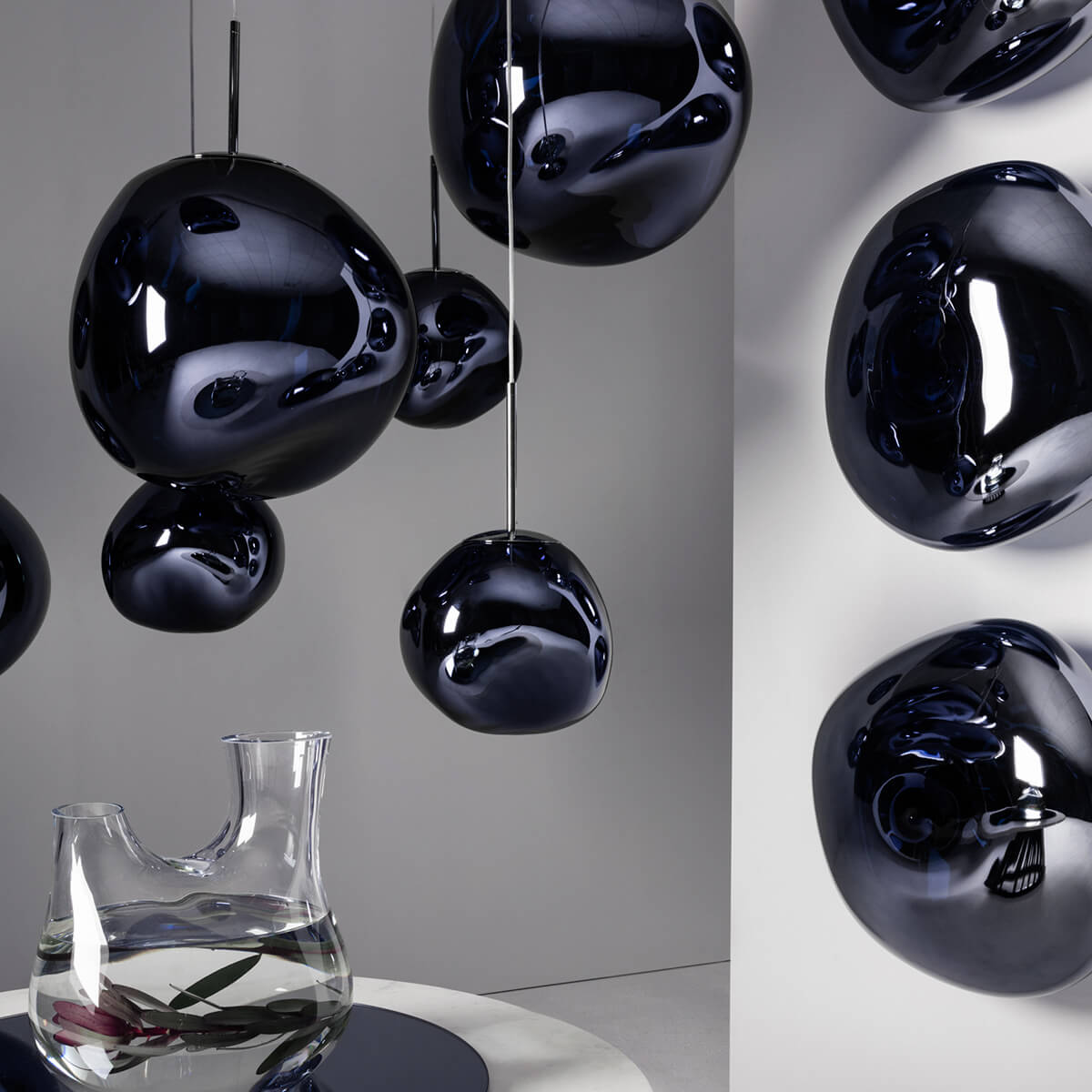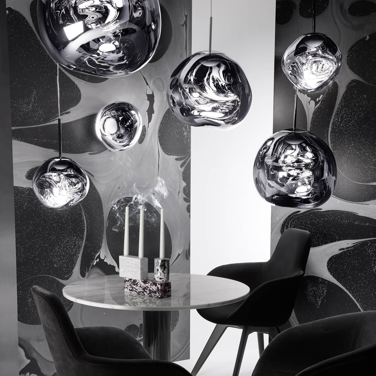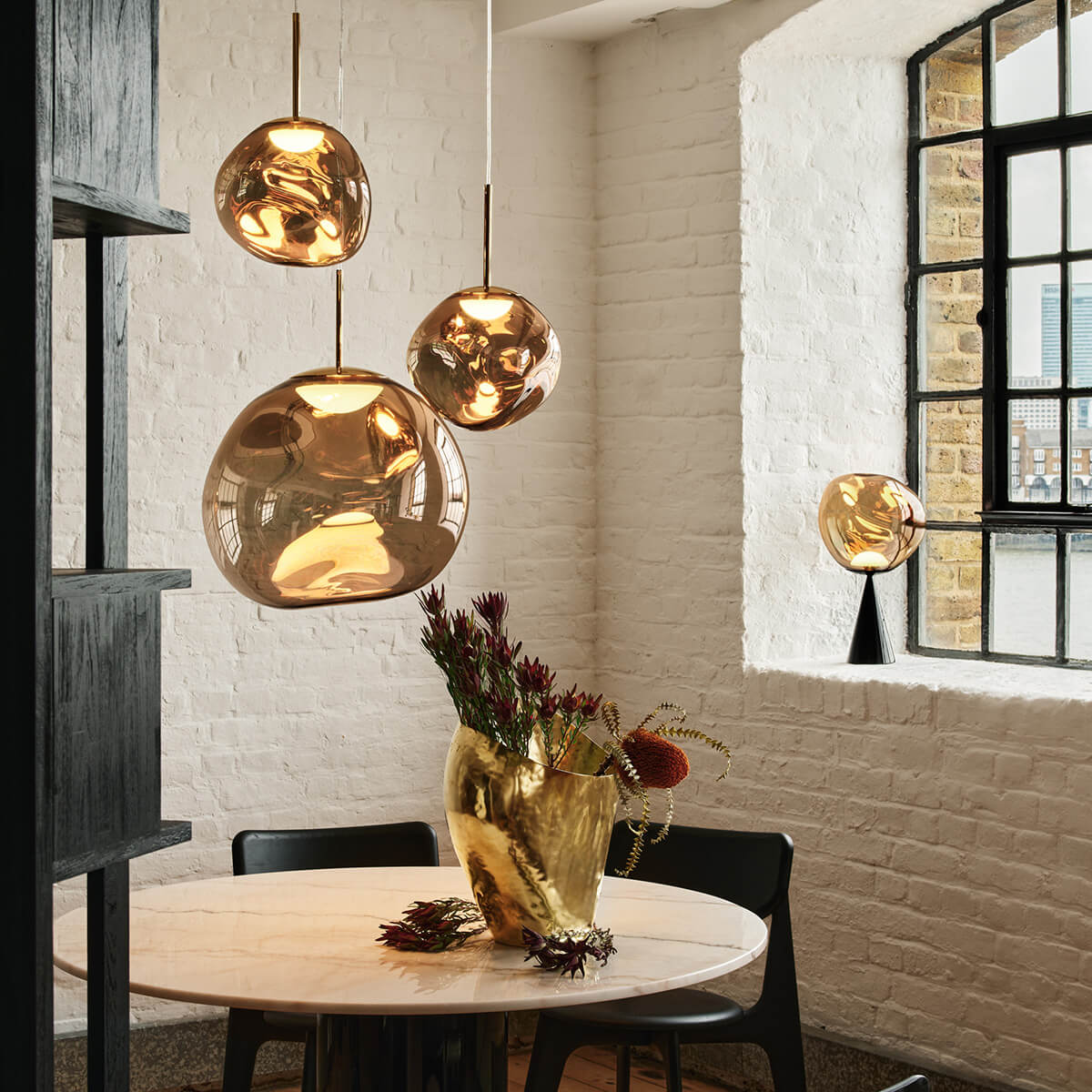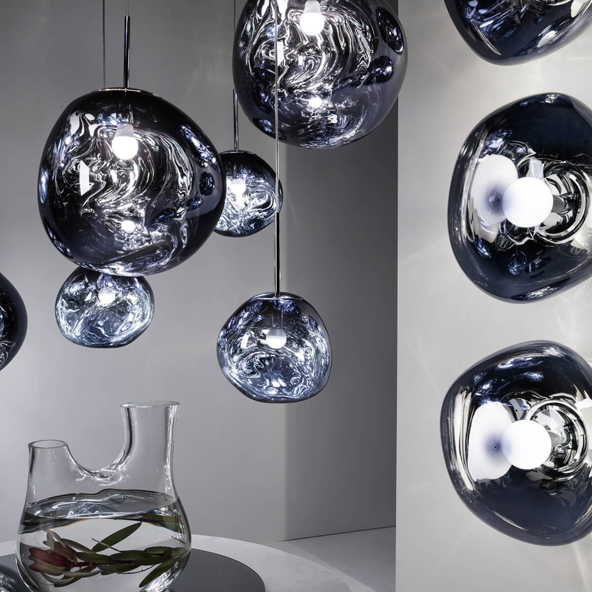 Erhältlich ist die Melt Mini, die in Zusammenarbeit Tom Dixons mit dem schwedischen Designkollektiv FRONT entworfen wurde, in den modernen Finishes Kupfer, Silber, Gold, Bronze und Smoke sowie in einer opaleszenten Variante mit silbern oder golden polierter Aufhängung. Ob einzeln oder in Kombination mit den größeren Melt Pendelleuchten, die Lampe setzt eindrucksvolle Akzente über Esstischen, Theken oder in Hotellobbys und Foyers.
