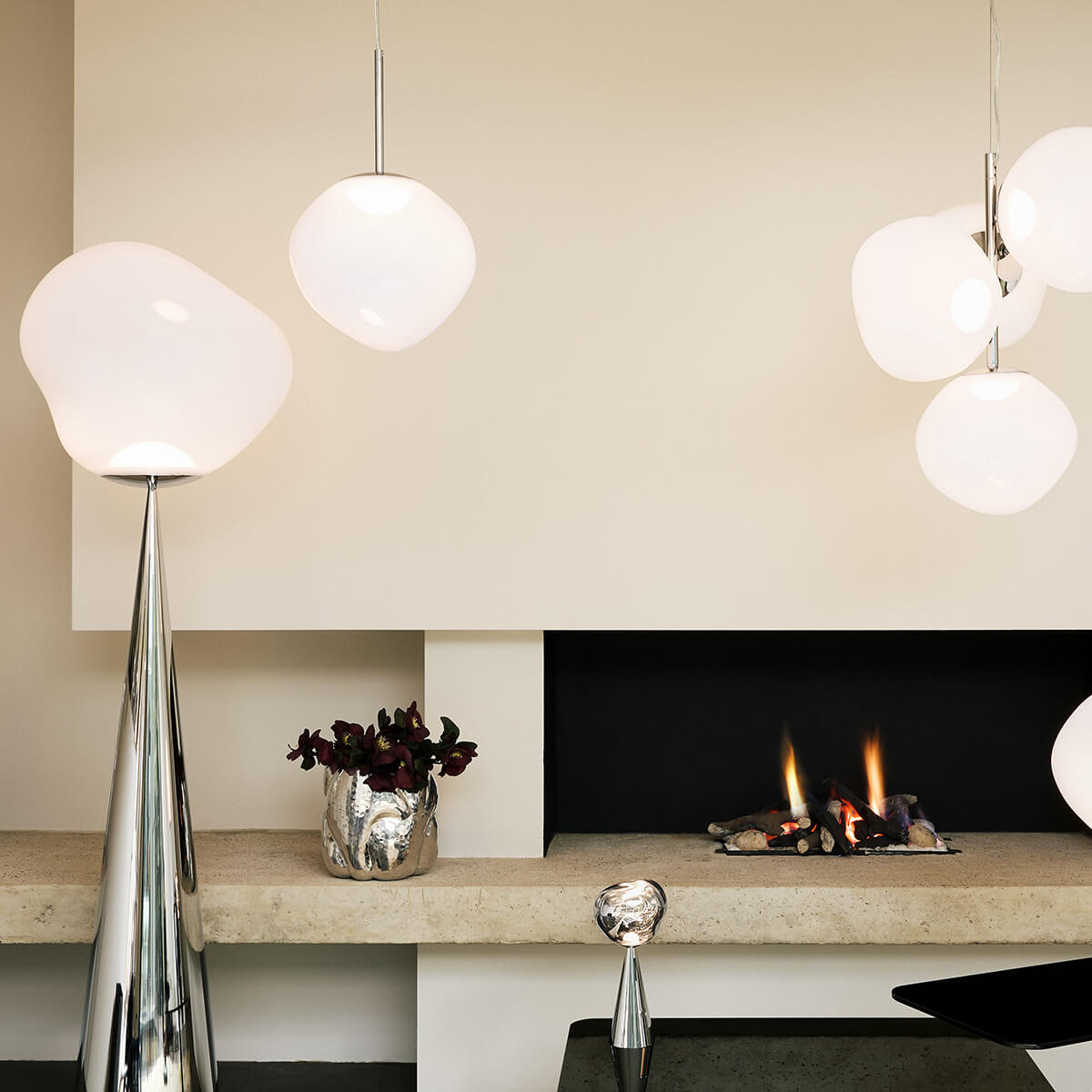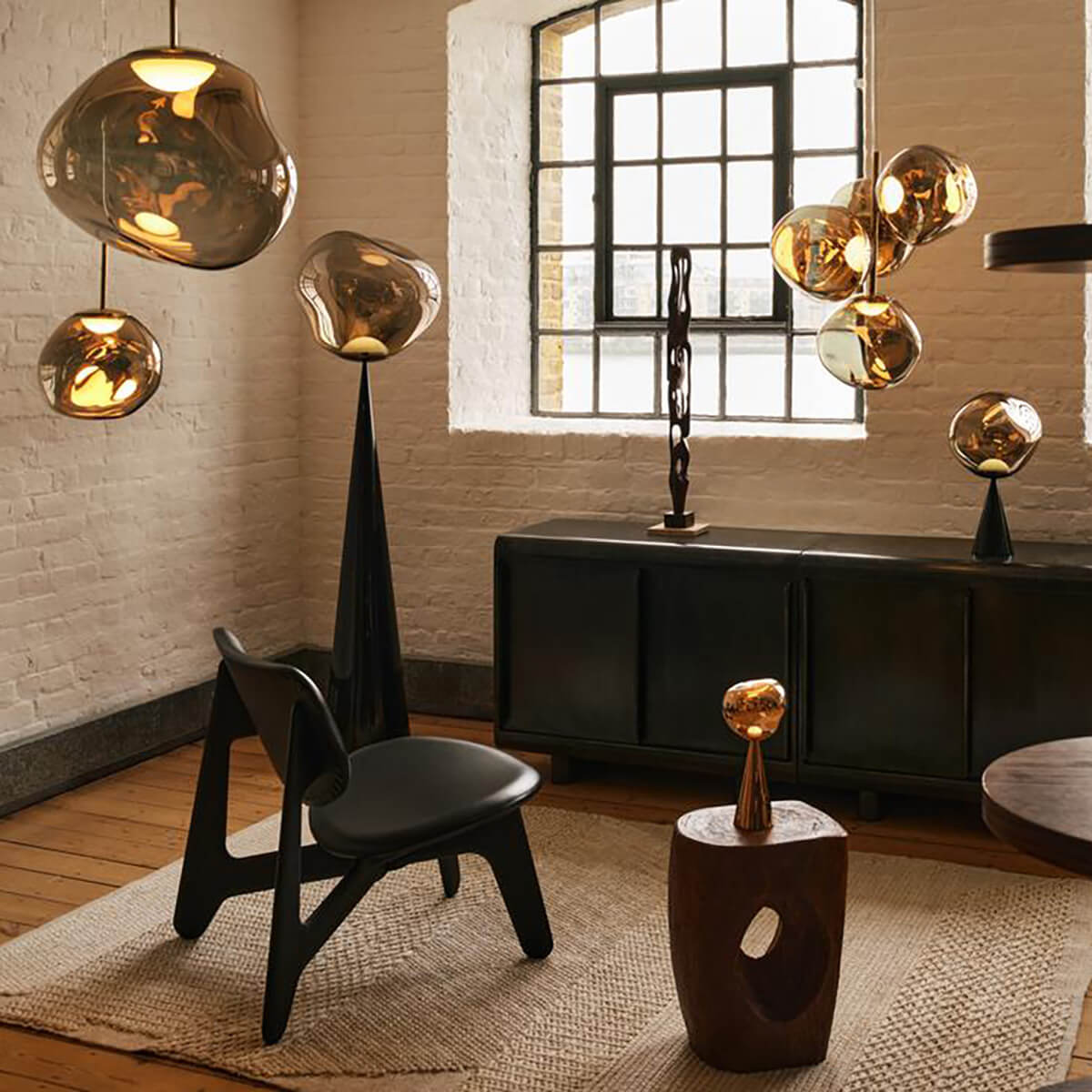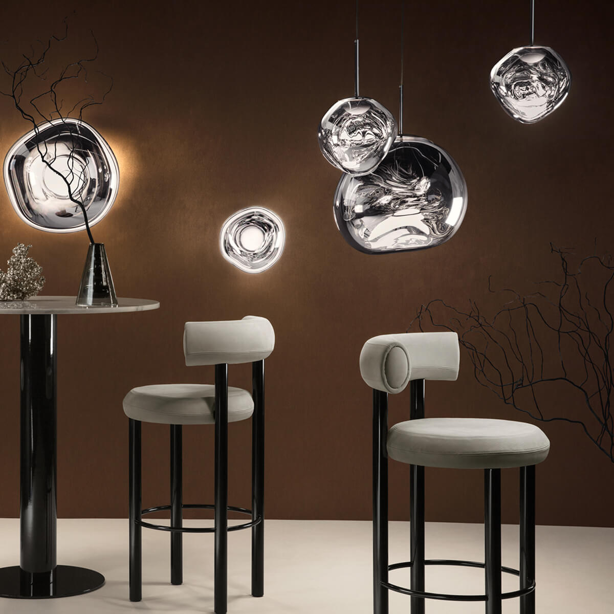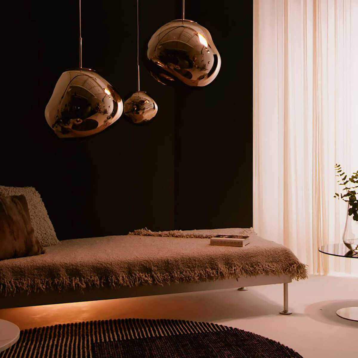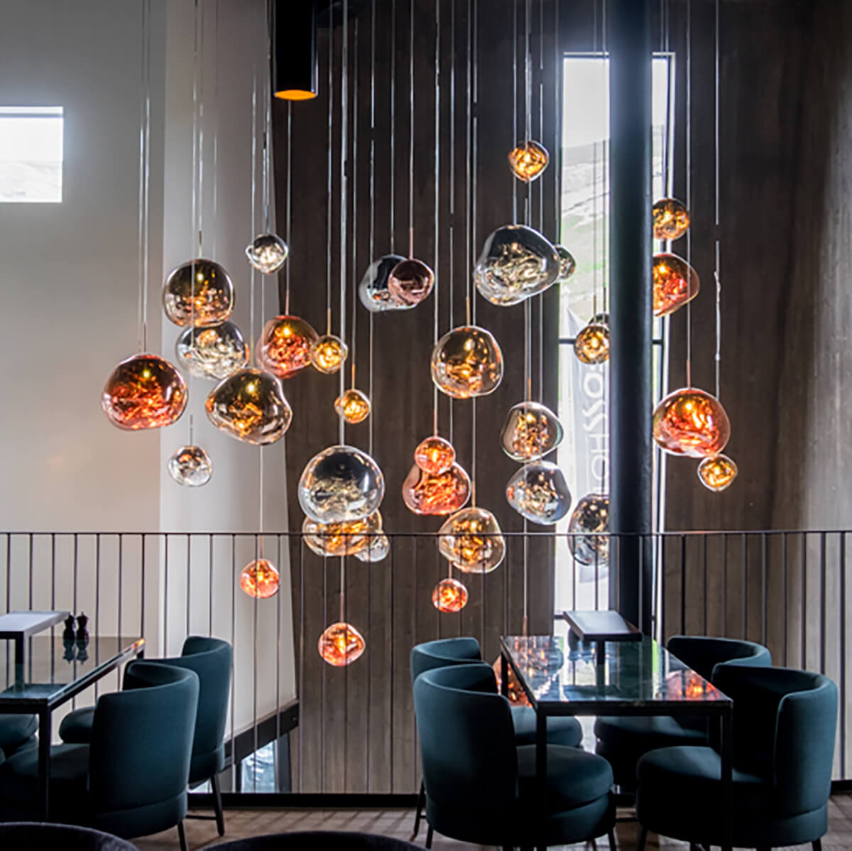 Erhältlich ist die Melt Mini, die in Zusammenarbeit Tom Dixons mit dem schwedischen Designkollektiv FRONT entworfen wurde, in den modernen Finishes Kupfer, Silber, Gold, Bronze und Smoke sowie in einer opaleszenten Variante mit silbern oder golden polierter Aufhängung. Ob einzeln oder in Kombination mit den größeren Melt Pendelleuchten, die Lampe setzt eindrucksvolle Akzente über Esstischen, Theken oder in Hotellobbys und Foyers.