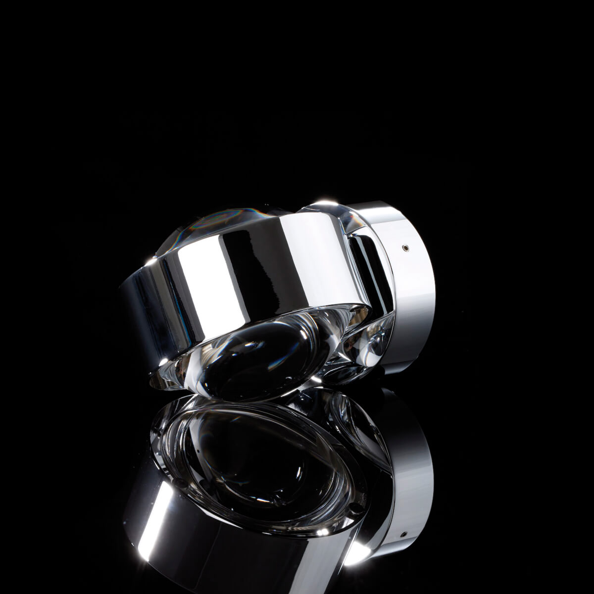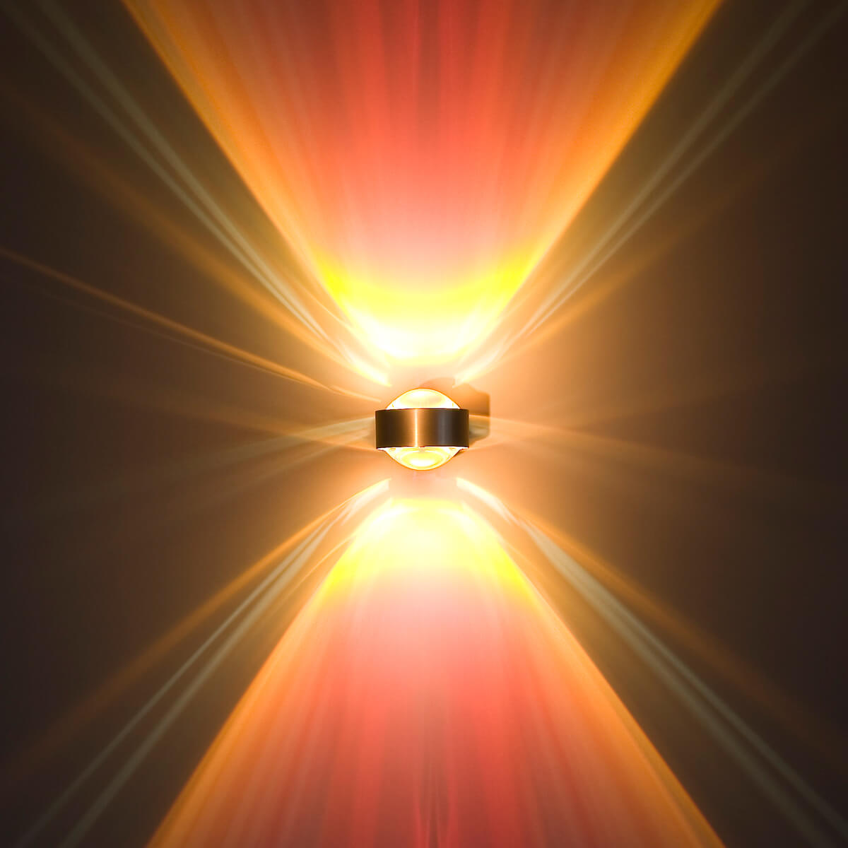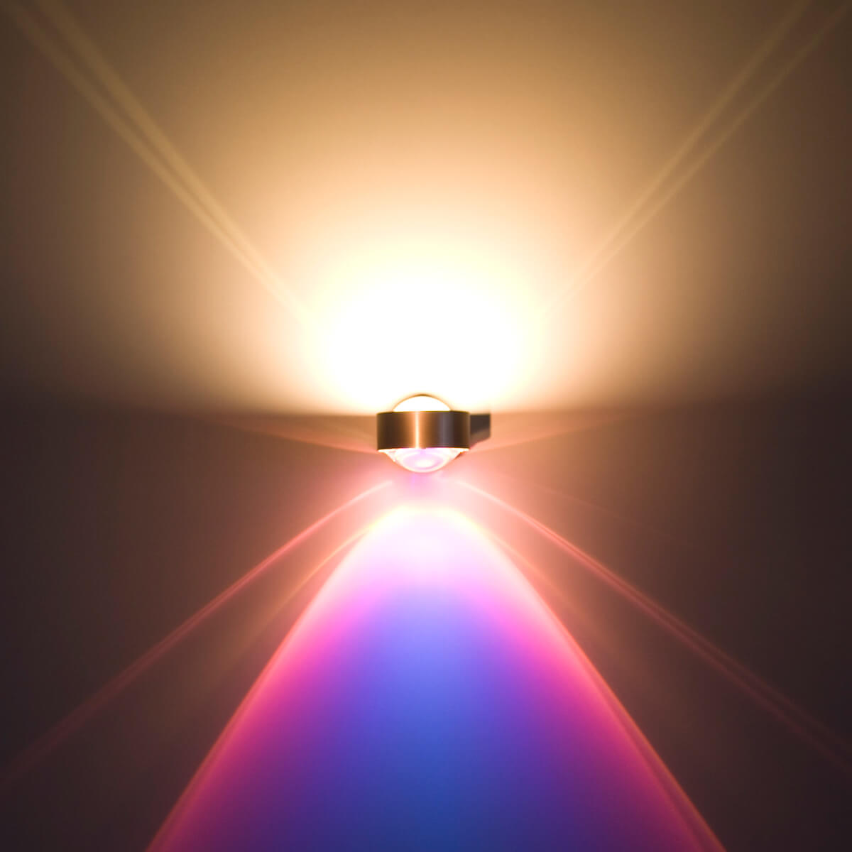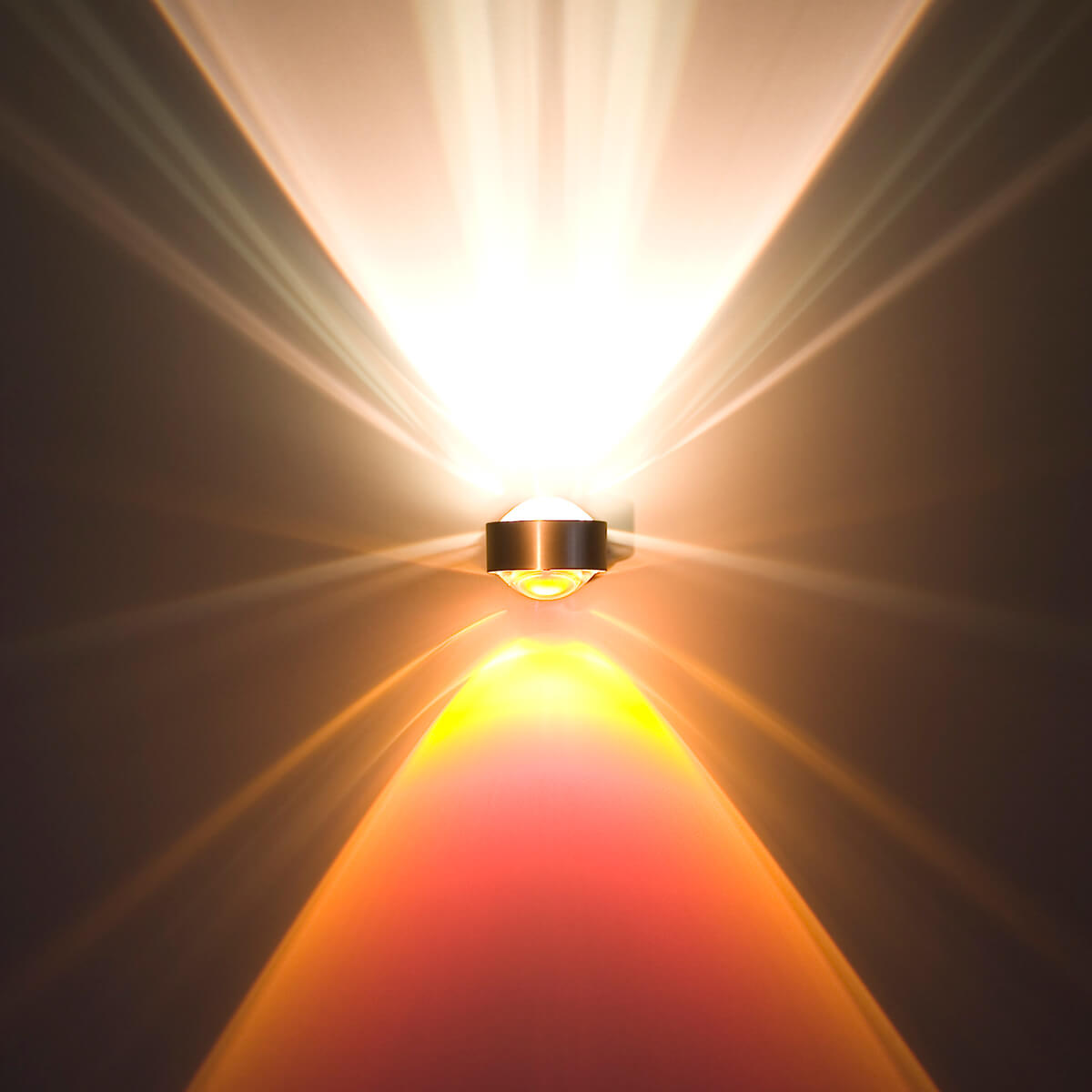 Je nach Zusammenstellung ergeben sich unterschiedliche Lichtszenarien: Klare Linsen überziehen die Wandfläche mit klar konturierten Lichtkegeln, einseitig mattierte Linsen verleihen den Kegeln eine weiche Silhouette. Satinierte Gläser wiederum verwandeln den Lichtausfall in eine ungerichtete Lichtdiffusion – ein Effekt, der sich vor allem für die Oberseite der Wandleuchte empfiehlt.