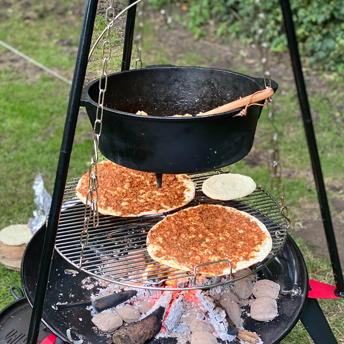 Da der Gusseisentopf an seiner Unterseite mit Füßen ausgestattet ist, lässt er sich auch problemlos in Kombination mit einem Lagerfeuer verwenden. Was sich alles mit dem Valhal Outdoor Feuertopf zubereiten lässt? Köstliche Braten, Schmorgerichte, Suppen und luftige Brote und Kuchen – kulinarischer Genuss beim Outdoor-Abenteuer ist damit garantiert!