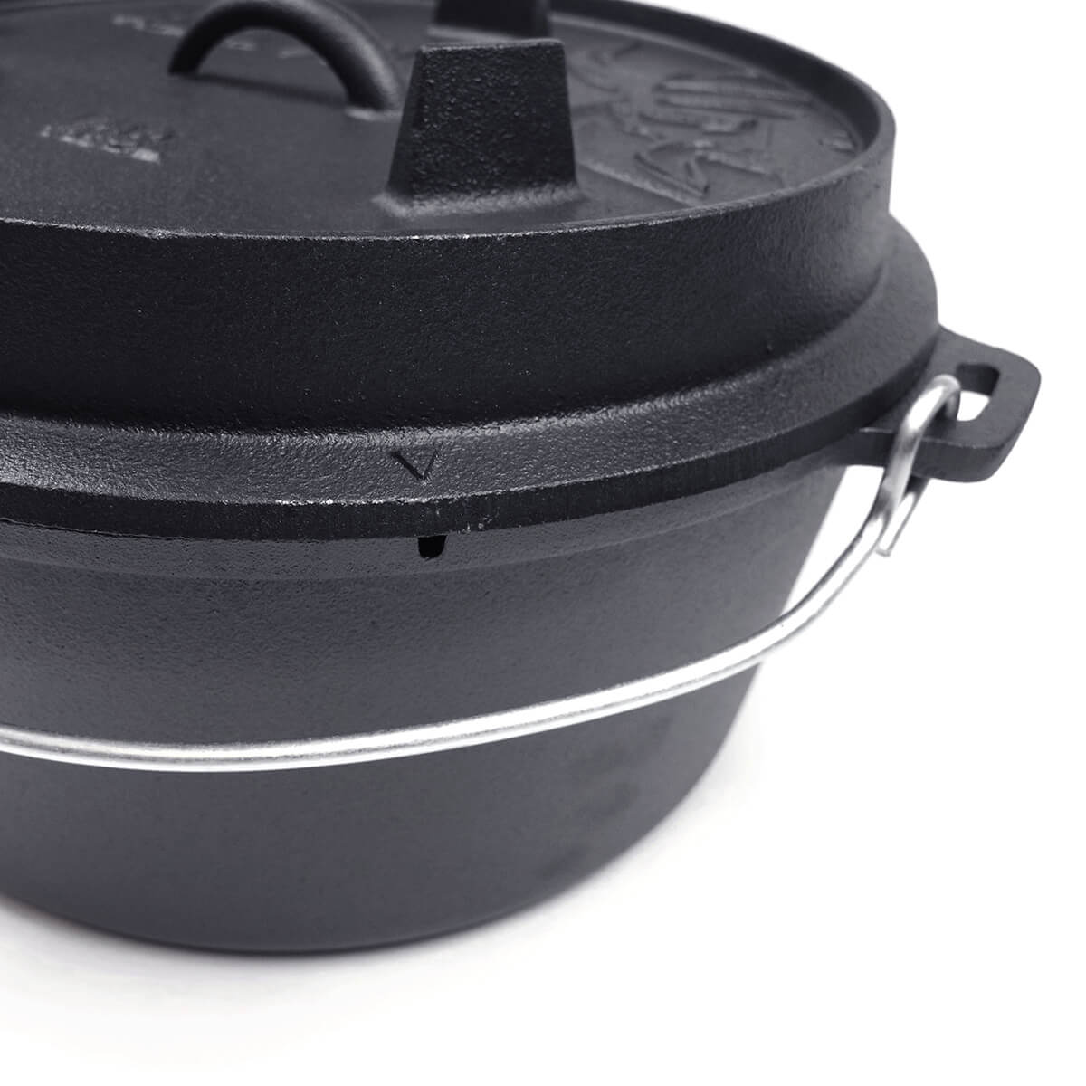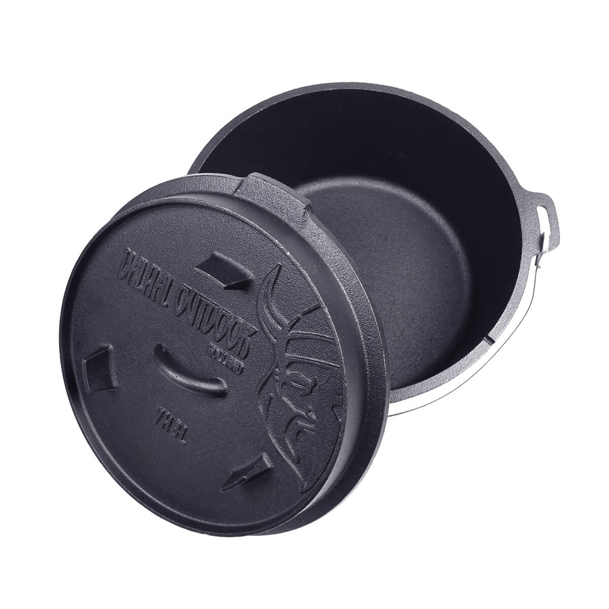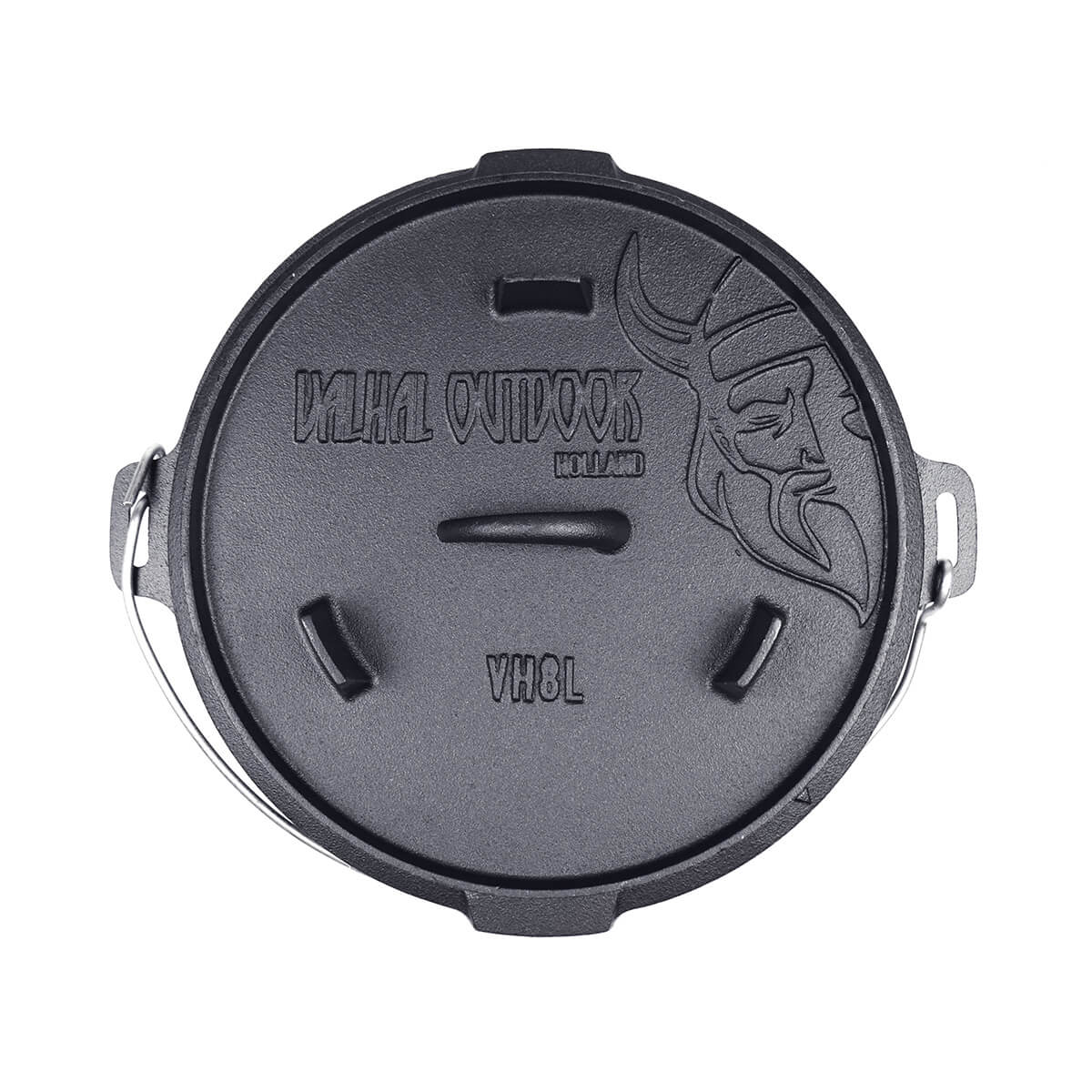 Der gusseiserne Valhal Outdoor Feuertopf 8L+2L ist ein vielseitig einsetzbares Kochgerät für Outdoor und Camping. Gusseisen ist dafür bekannt, Wärme optimal zu leiten und zu speichern. Deshalb kann der Topf mit unterschiedlichsten Wärmequellen befeuert werden: Platzieren Sie ihn einfach im Ofen, nahe der Glut oder auf dem Holzkohlegrill – und schon kann es mit dem Kochvergnügen losgehen. Dank seines Henkels lässt sich der Dutch Oven auch über das offene Feuer hängen, etwa an einen Schwenkgrill.
