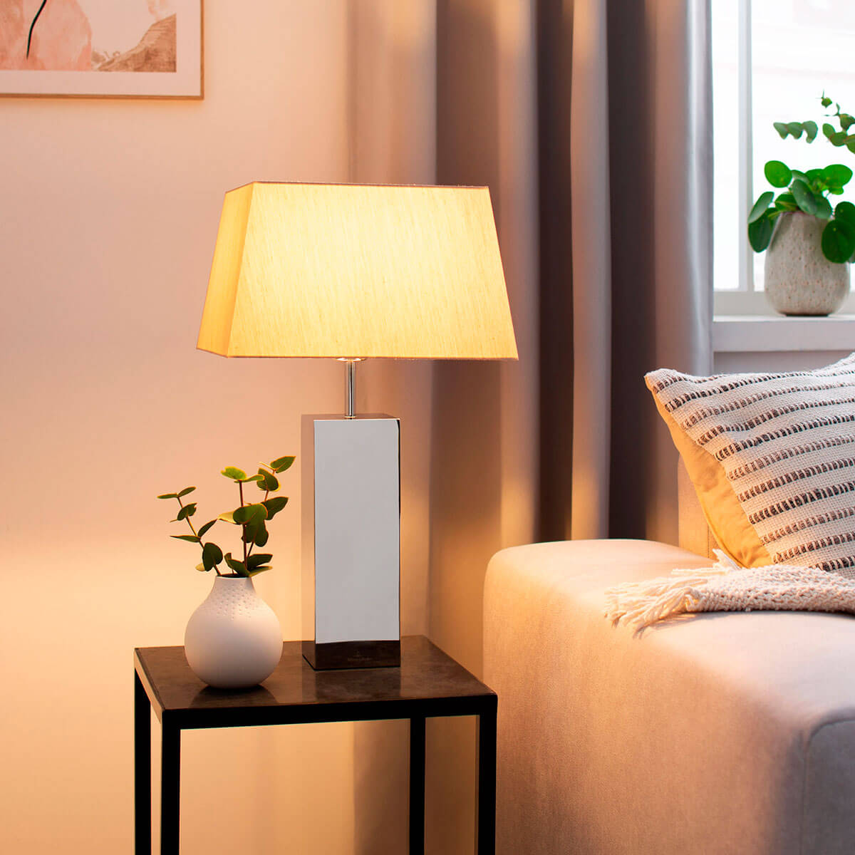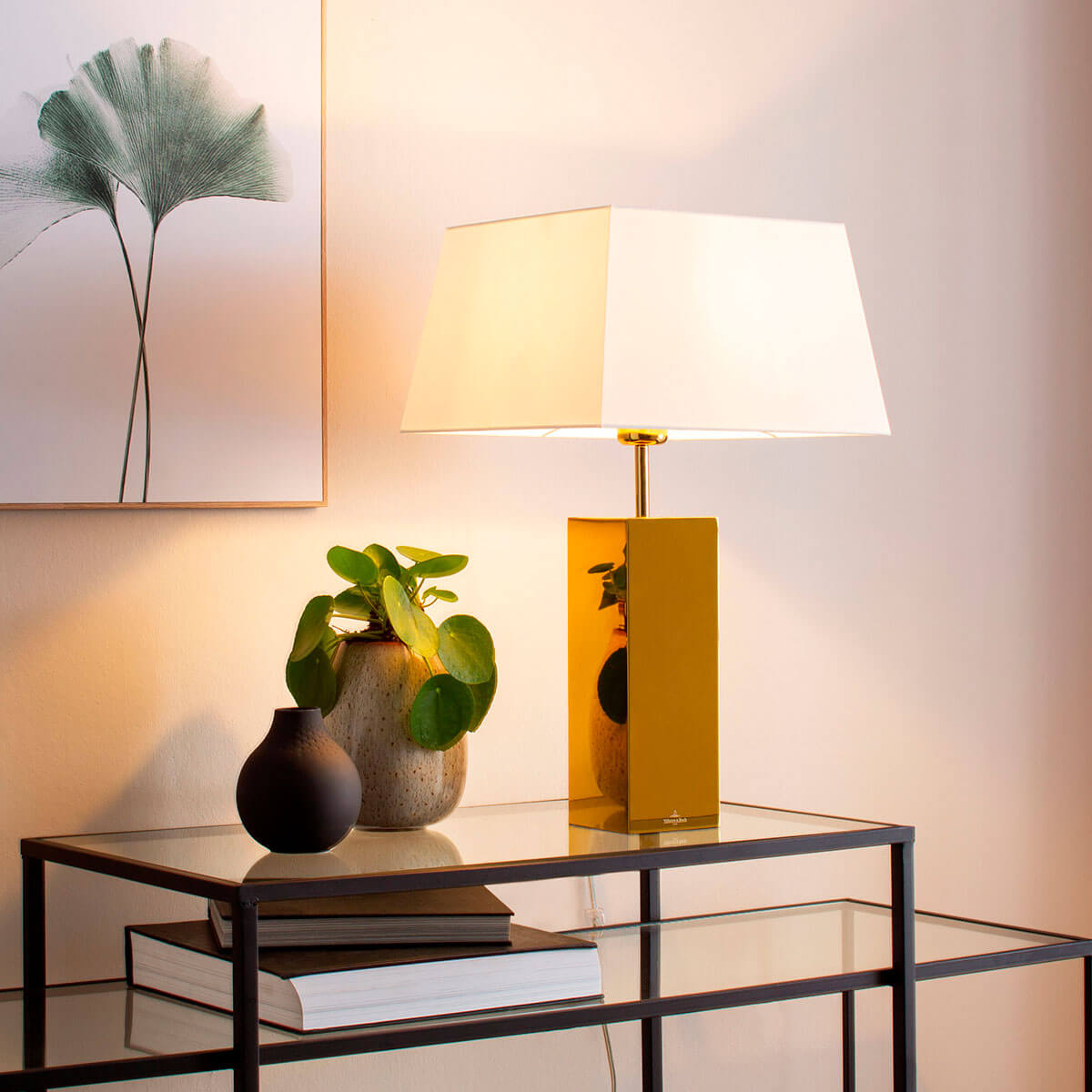 Die Tischleuchte Prag besticht durch ihr zeitloses Design. Der quadratische Leuchtenfuß, wahlweise aus poliertem oder goldfarbenem Edelstahl, verleiht der Leuchte eine edle Anmutung und setzt stilvolle Akzente. Der hochwertige Stoffschirm in klassischem Weiß oder warmem Beige harmoniert perfekt mit dem glänzenden Leuchtenfuß und sorgt für ein weiches, angenehmes Licht.