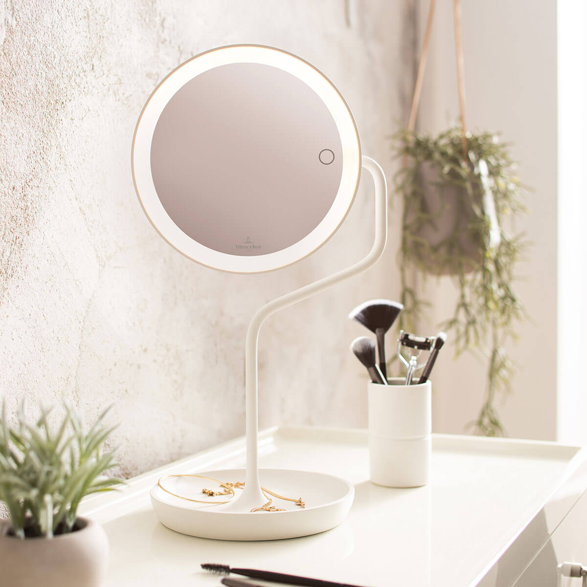Die Versailles LED Akkuleuchte der Traditionsmarke Villeroy & Boch ist ein vielseitiges Lichtinstrument mit stilvoller Note. Ausgestattet mit einem wiederaufladbaren Akku, einer Ablagefläche und einem drehbaren Spiegel, lässt sich die Lampe als Tischleuchte und beleuchteter Kosmetikspiegel gleichermaßen nutzen.