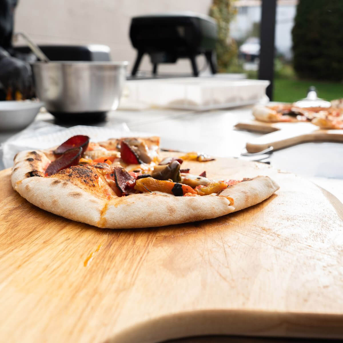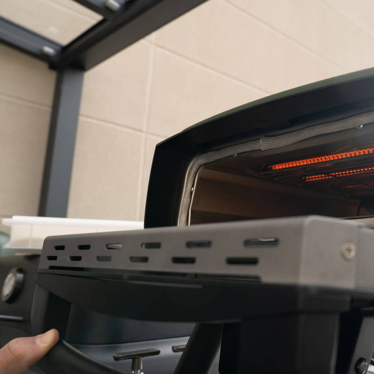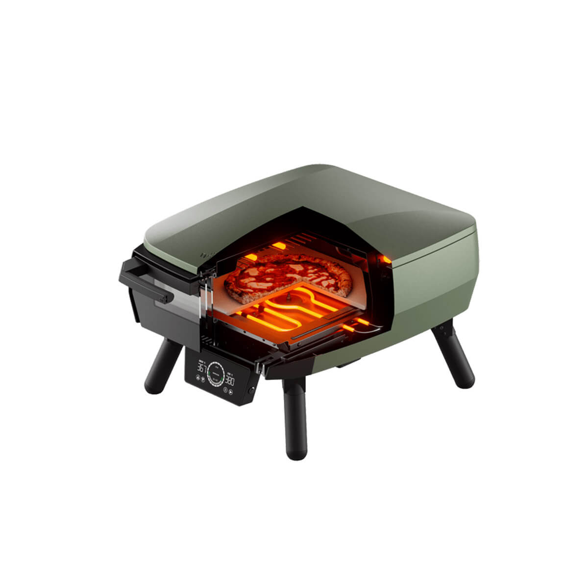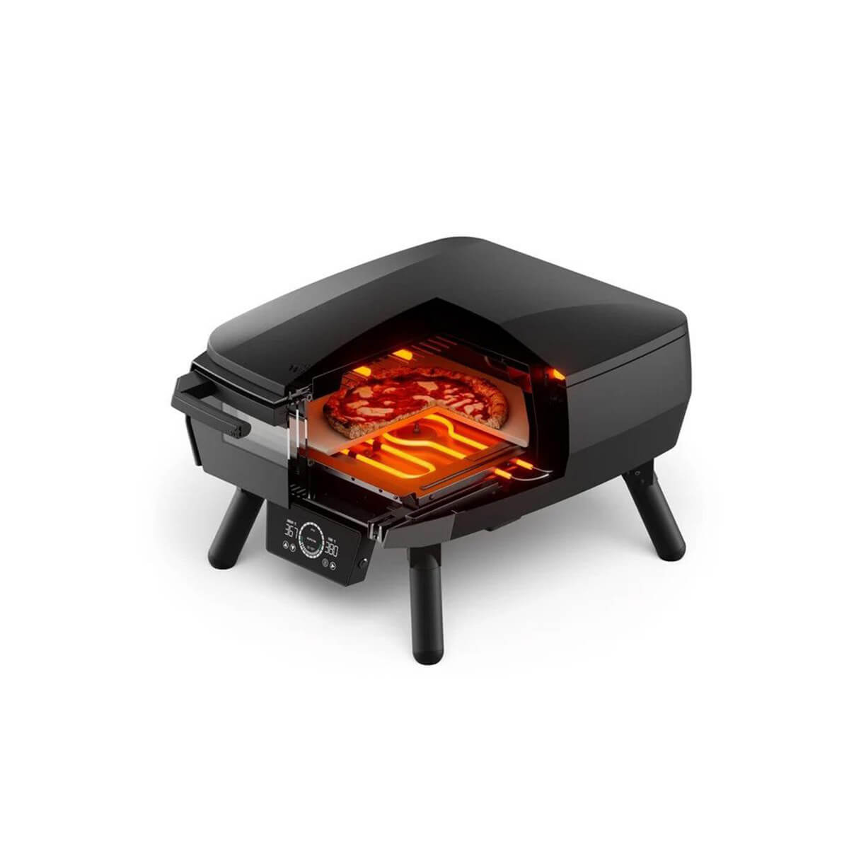 Herzstück des Ofens ist die fortschrittliche Carbon Fiber Tube Heating Technology – ein oben angebrachtes Kohlefaser-Heizelement, das für eine kraftvolle, gleichmäßige Oberhitze sorgt. Ergänzt wird es von einem 2,4-kW-Booster-Brenner und einem feststehenden 13-Zoll-Pizzastein aus Cordierit. So erreicht der Garraum in nur etwa 11 Minuten die nötige Temperatur für knusprige Pizza mit schön gebackenem Boden und aromatischem Rand. Je nach Einstellung sind Backzeiten von 60 bis 90 Sekunden möglich – ideal für alle, die Pizza lieben, aber nicht lange warten möchten.