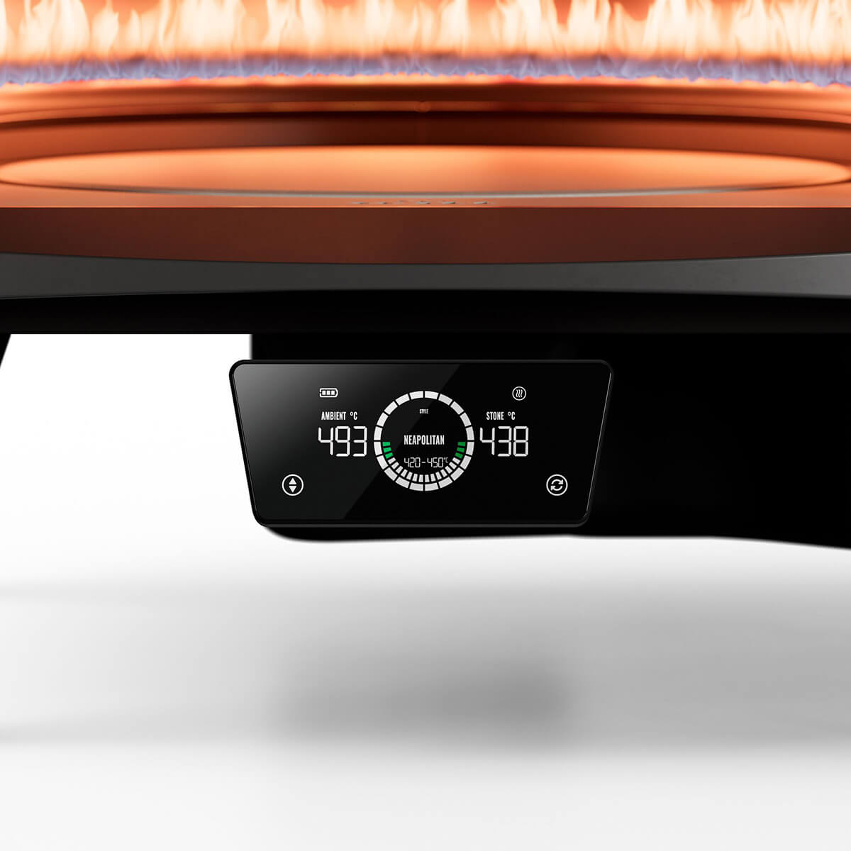 Besonders komfortabel ist die präzise Steuerung. Das abnehmbare LCD-Display zeigt Ihnen alle relevanten Informationen auf einen Blick: Steintemperatur, Garraumtemperatur, Booster-Status und Akkustand. Für die Temperaturüberwachung sorgen ein Steinsensor und zwei Garraumsensoren. Die Bedienung erfolgt intuitiv via Touch- und Drehsteuerung, sodass Sie die Backbedingungen stets gezielt anpassen können.