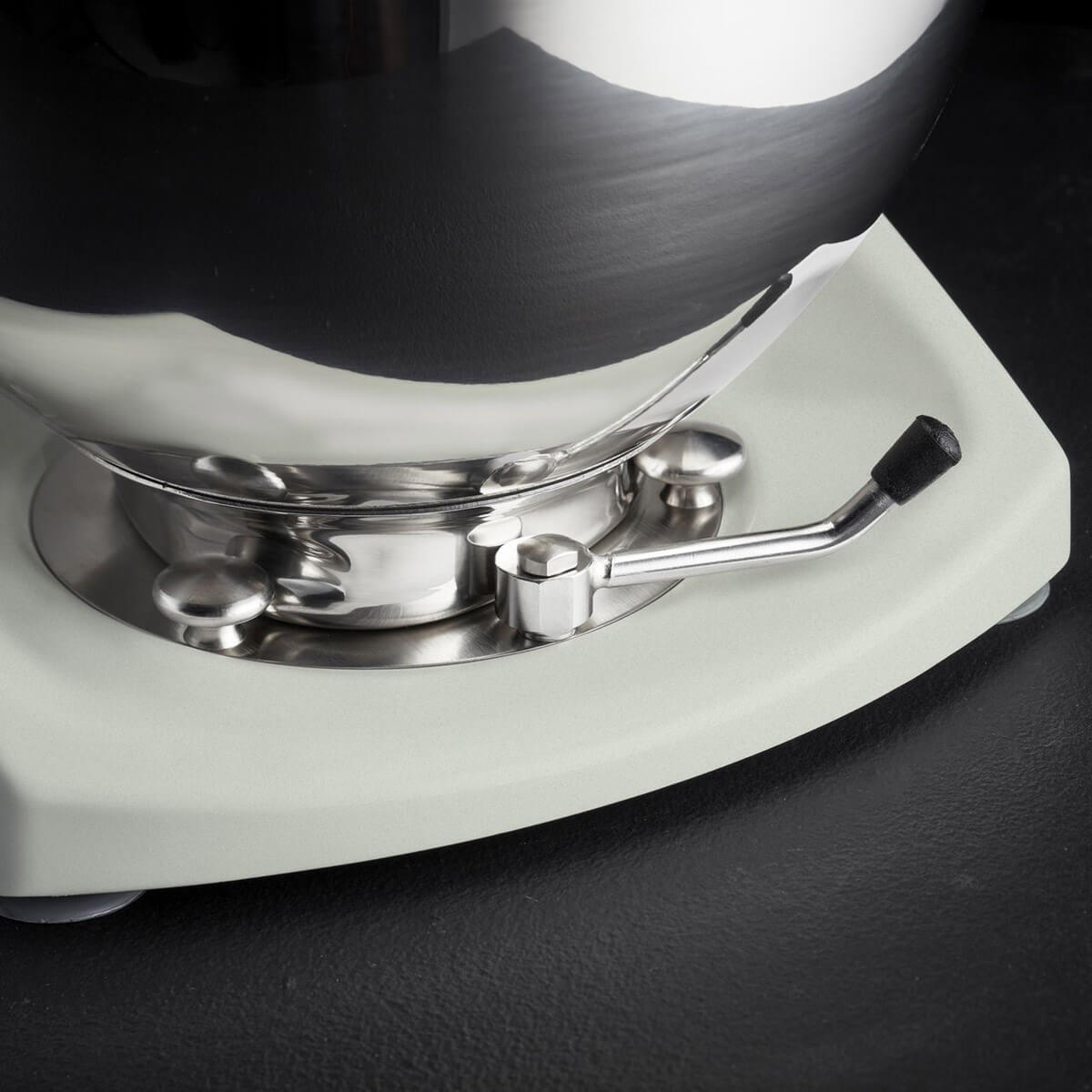 Das Design des Mixers verbindet Funktionalität mit klarer, skandinavischer Formensprache. Gefertigt aus präzisionsgegossenem Aluminium, kommt die Teigmaschine ohne außenliegende Schrauben oder unnötige Öffnungen aus. Abgerundete Kanten und glatte Flächen erleichtern die Reinigung und unterstützen den hochwertigen Gesamteindruck. Der breite Standfuß und Saugnäpfe sorgen für Stabilität während des Betriebs, sodass der Mixer auch bei schwereren Teigen sicher an seinem Platz bleibt.